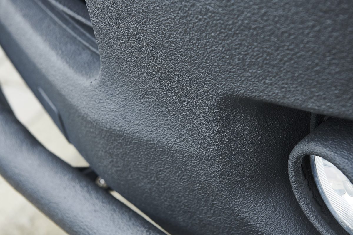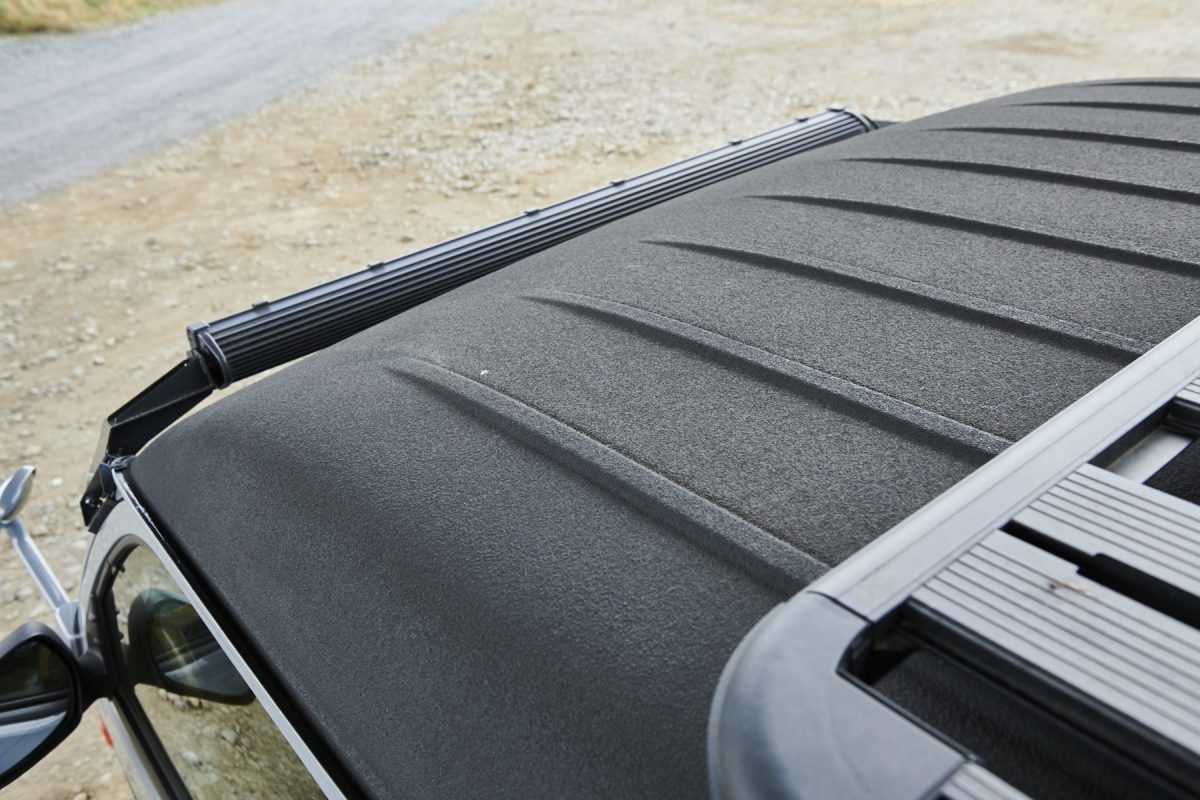 ルーフにもLINE-X塗装が施されている。LINE-Xはキズやサビからボディを「守る」効果が本来の価値だが、サラっとした独特の塗装面はカスタムペイントとしても人気上昇中だ! この車両はルーフラックやオーニングも装備している。