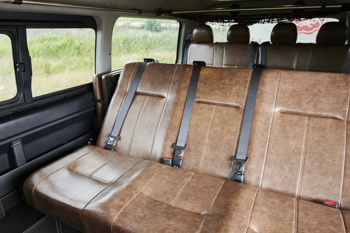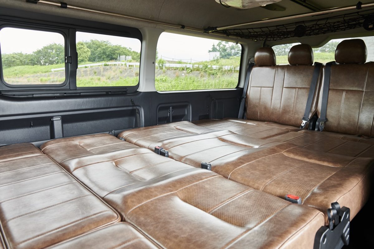 車中泊仕様「FD-BOX」シリーズの0(ゼロ)というシートレイアウト。広大なフラットレイアウトはもちろん、ワゴンGLの定員10名はそのまま確保している。4列目の純正シートをそのまま採用することで価格も抑えられている。雰囲気の良いヴィンテージレザー調のスペシャル仕様。