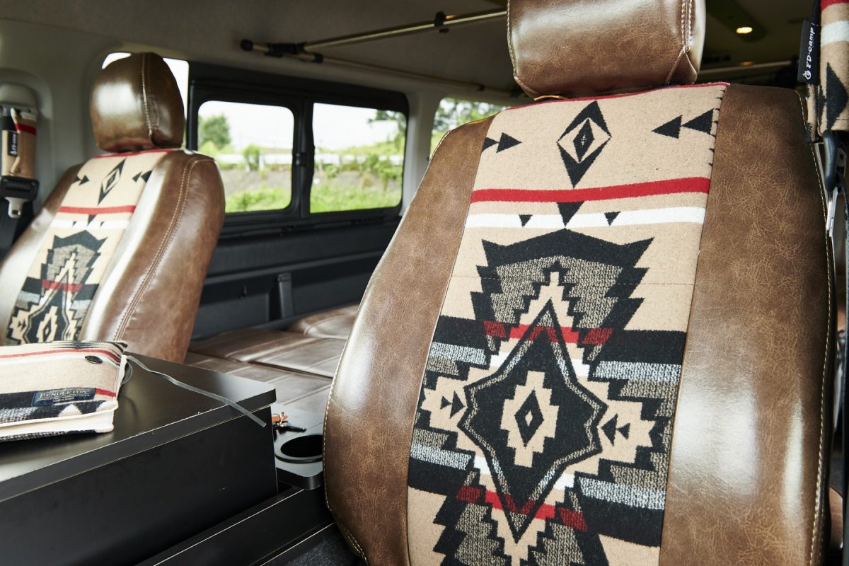 ペンドルトンとのコラボにより製作されたフロントシートカバーは、フレックス・ドリームではお馴染みのもの。(ペンドルトン正規品)