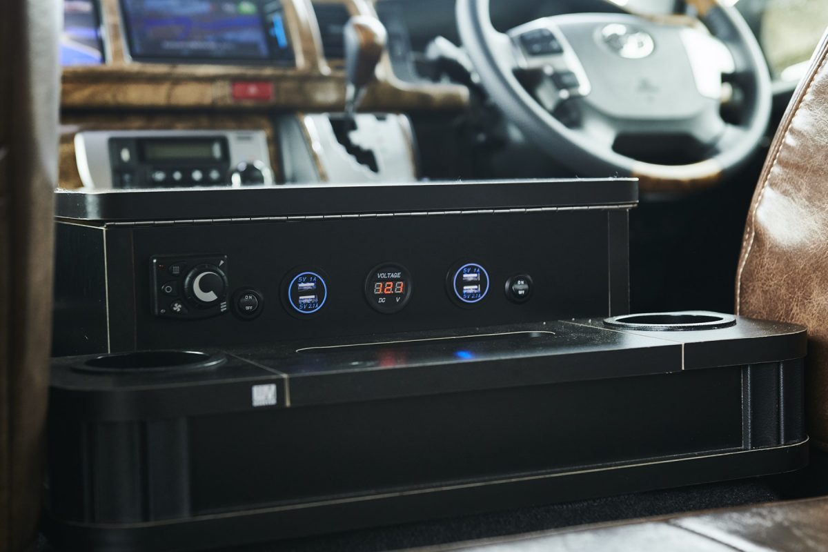 サブバッテリーを搭載し、エンジンオフでも電子機器の充電だけでなく、FFヒーターも一晩中使用可能。真冬でも半袖で過ごせる。