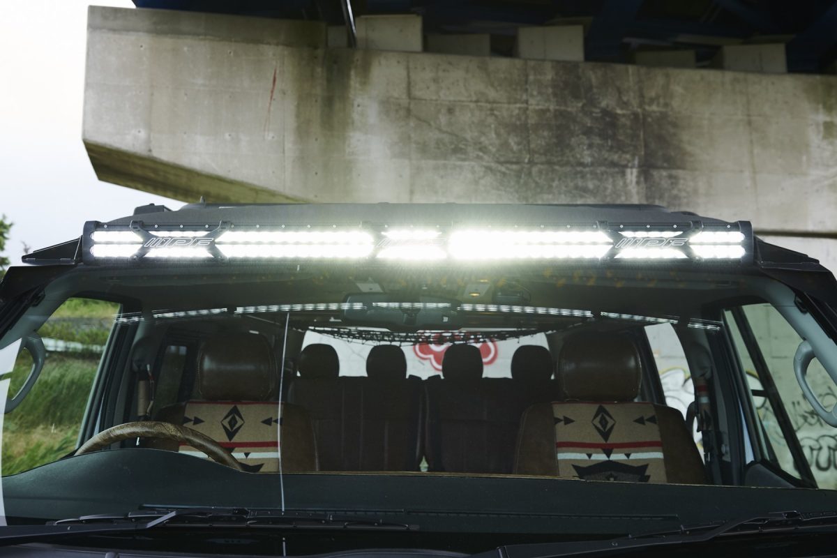 フロントウィンドー上部に灯のない山奥でも安全な視界を確保するIPF製のLEDライトバーを装備。(走行中は点灯禁止!!)