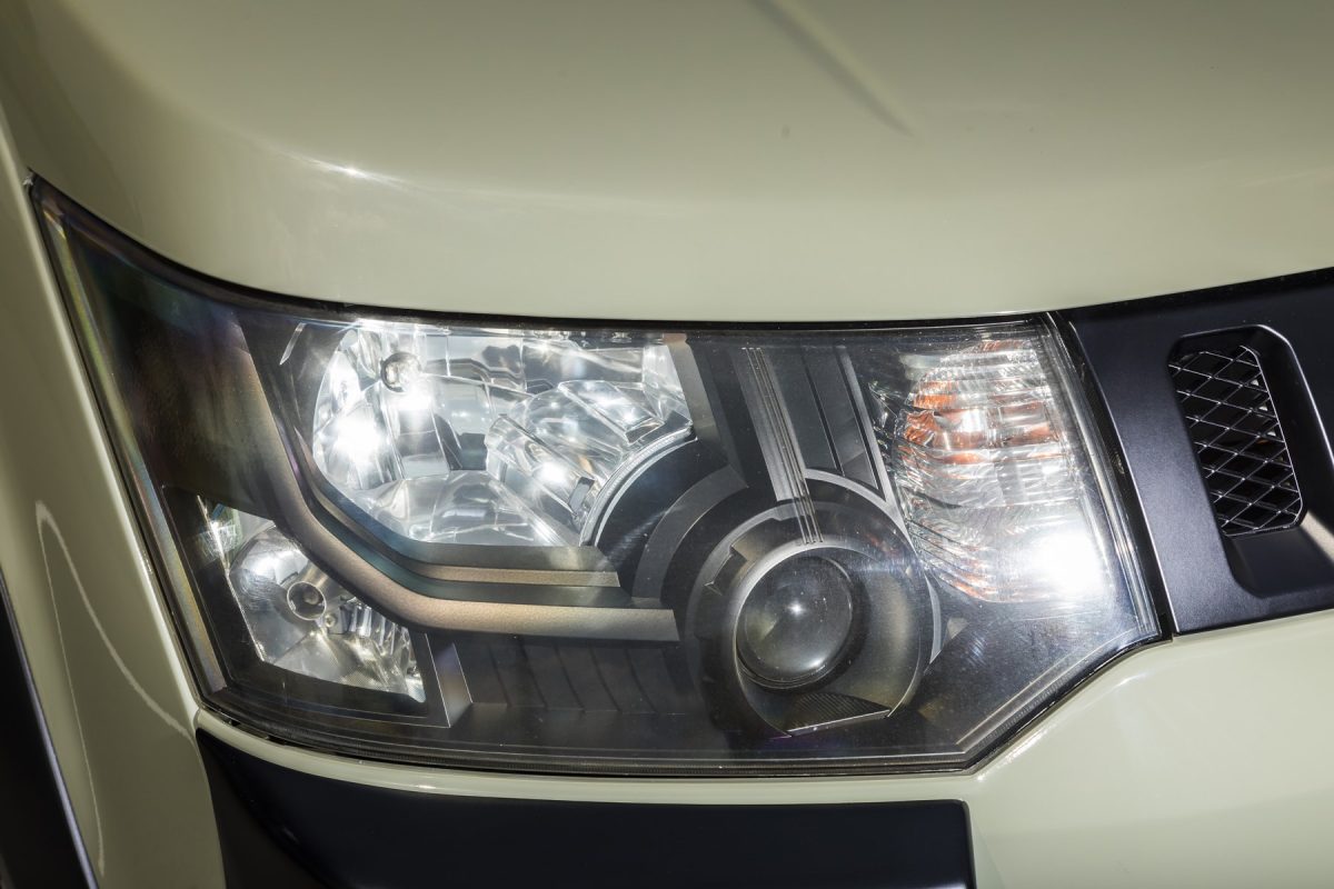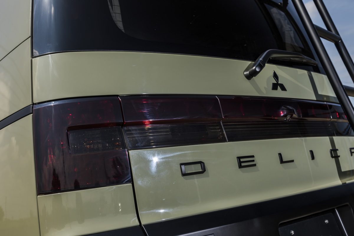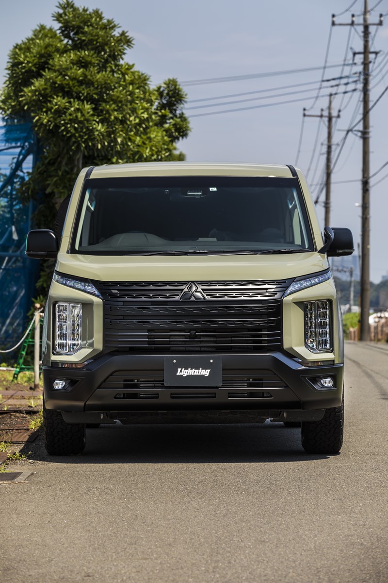 新型モデルの特徴的なダイナミックシールドグリルは丸ごとブラックアウト。さらにロアバンパーやサイドシルなどもブラックで塗装している。ギラギラしたイメージが強い新型デリカD:5だが、落ち着いた雰囲気のボディカラーと黒塗装のグリルによって驚くほど硬派な雰囲気。