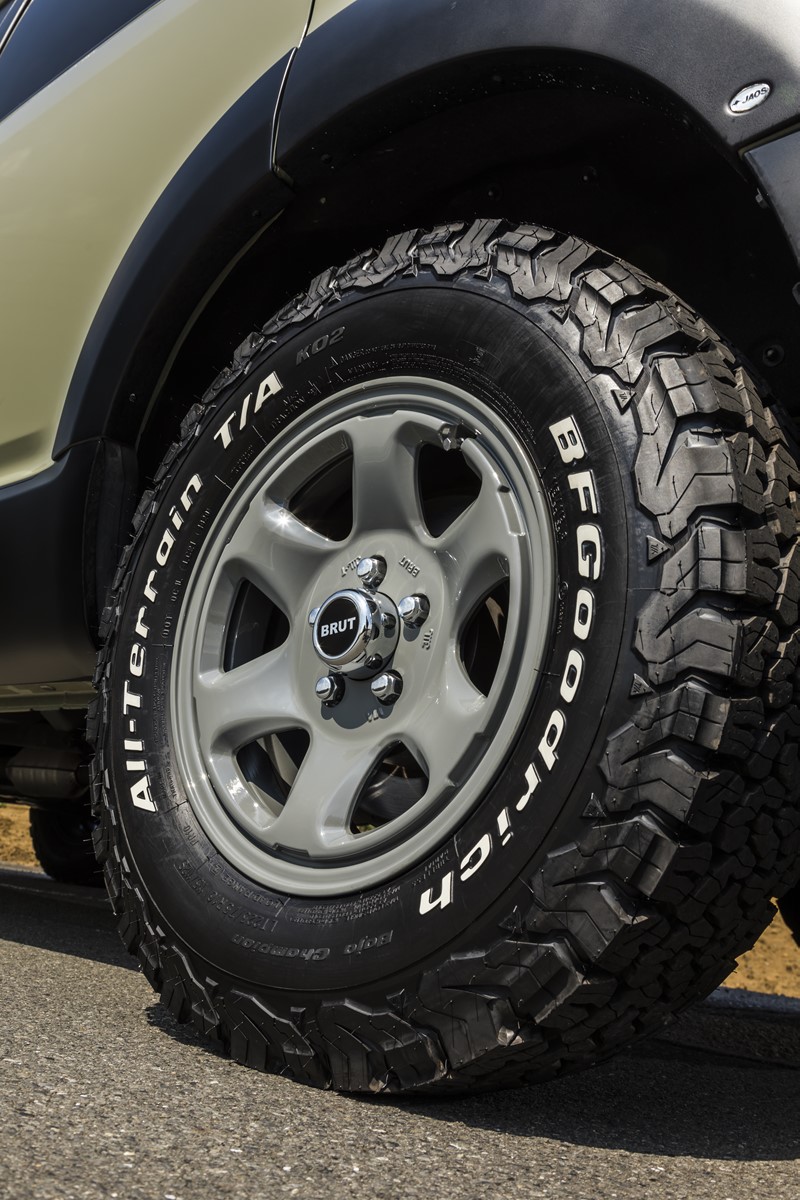 パッと見は純正のスチール製に見えるホイールはBRUT BR 44というアルミ。225/ 75‐16のオールテレーンタイヤをセット。