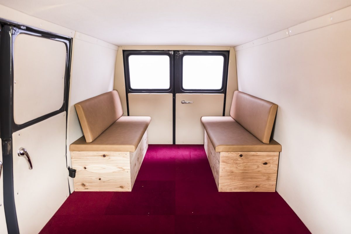 カーゴスペースは内装がしっかり貼られており、対面ベンチシートが設置されているが、将来的には冷蔵設備を搭載したいそうだ。