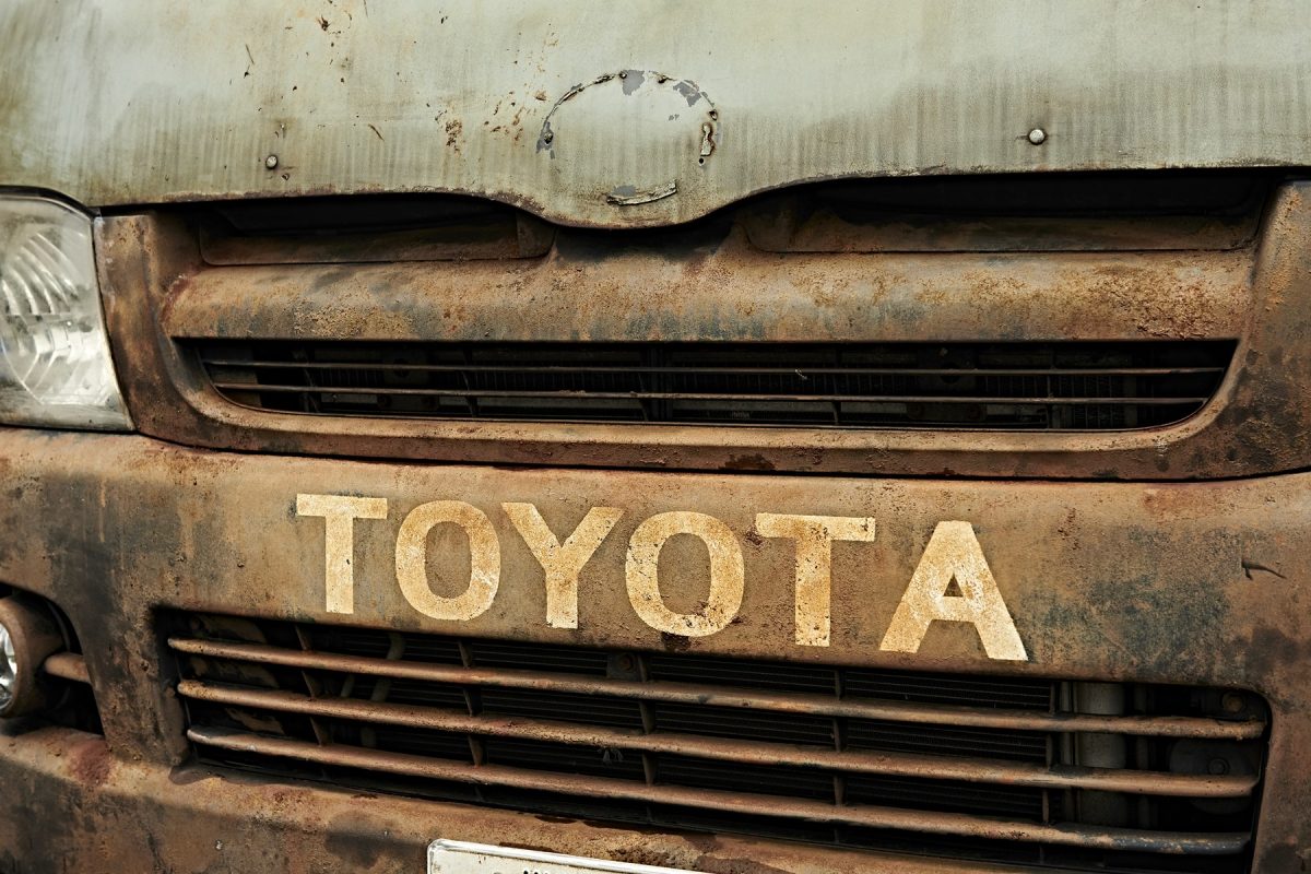 往年のトヨタ車を彷彿とさせる、フロントのTOYOTAのアルファベットエンブレム。それを味わい深いペイントで再現している。