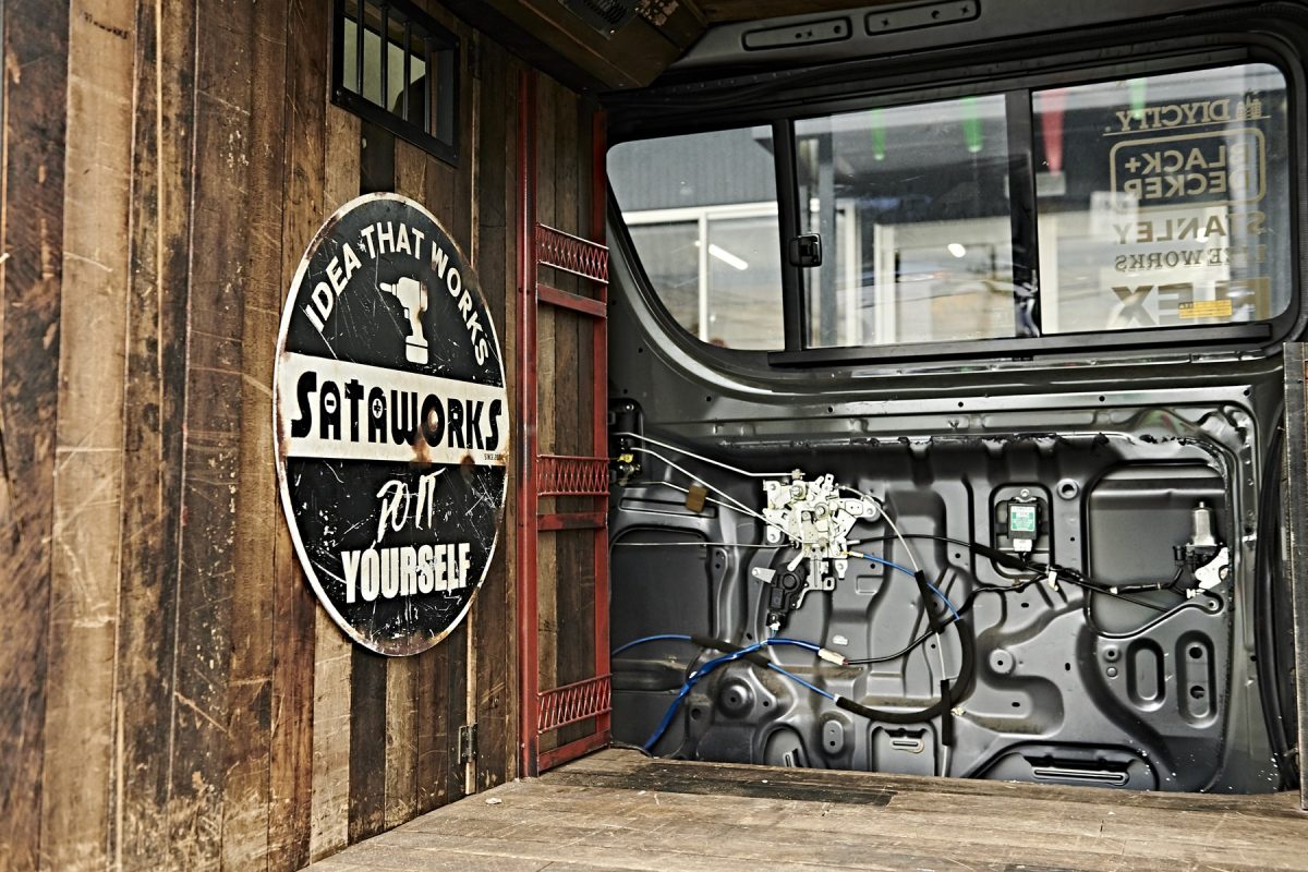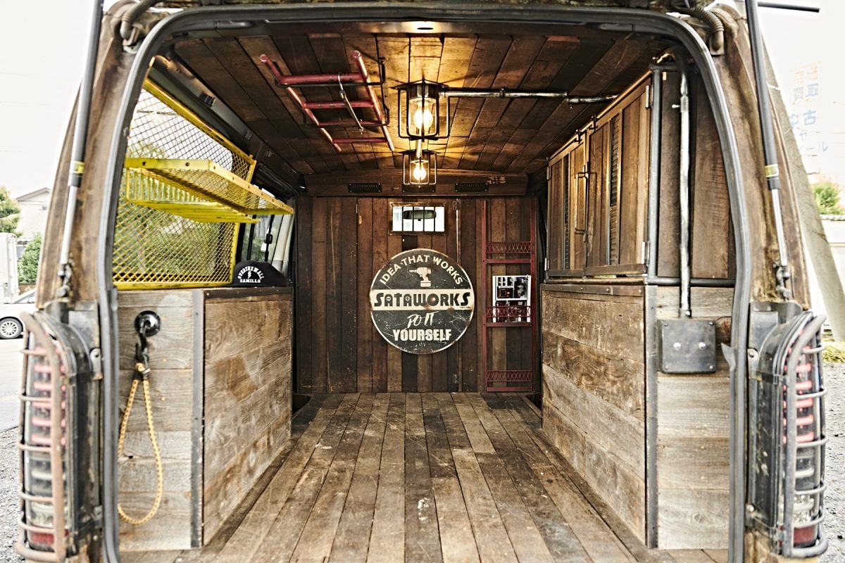 フロントシートとの間は古材で仕切り、そこに佐田工務店の大きな看板をセット。右スライドドアの内装も取っ払って男らしい雰囲気を演出。