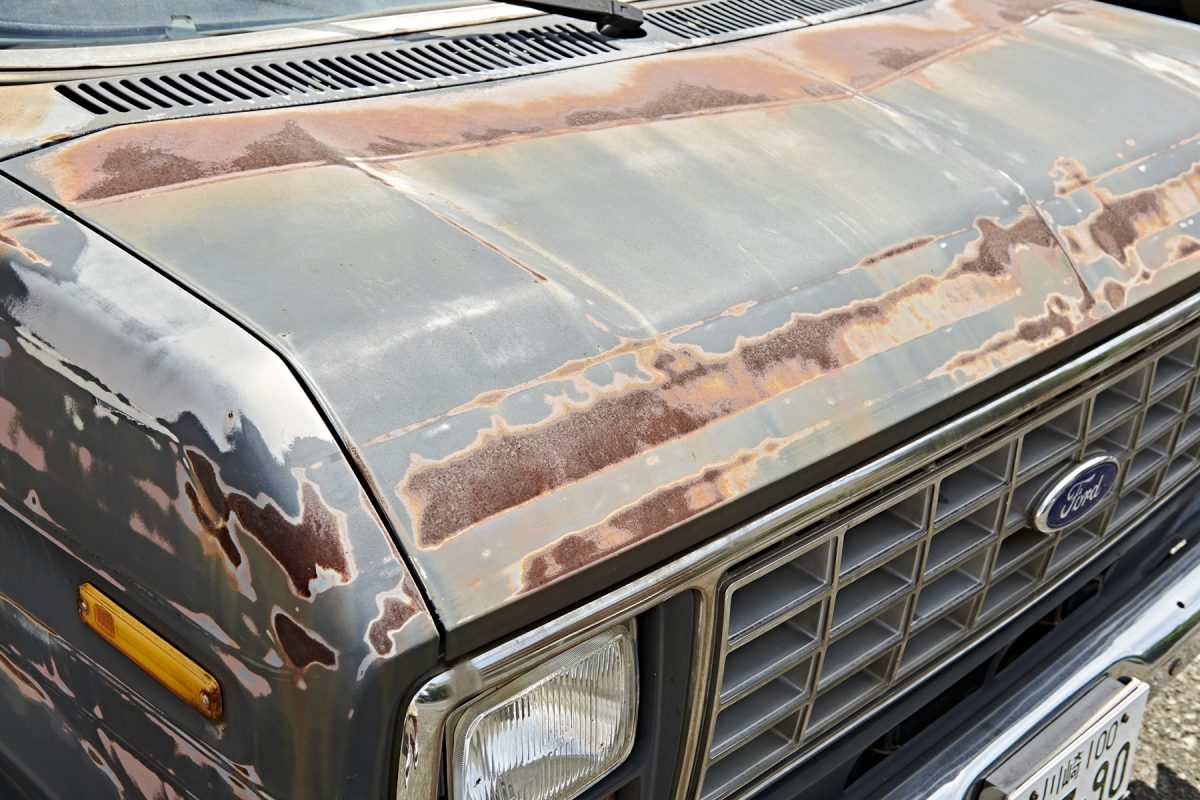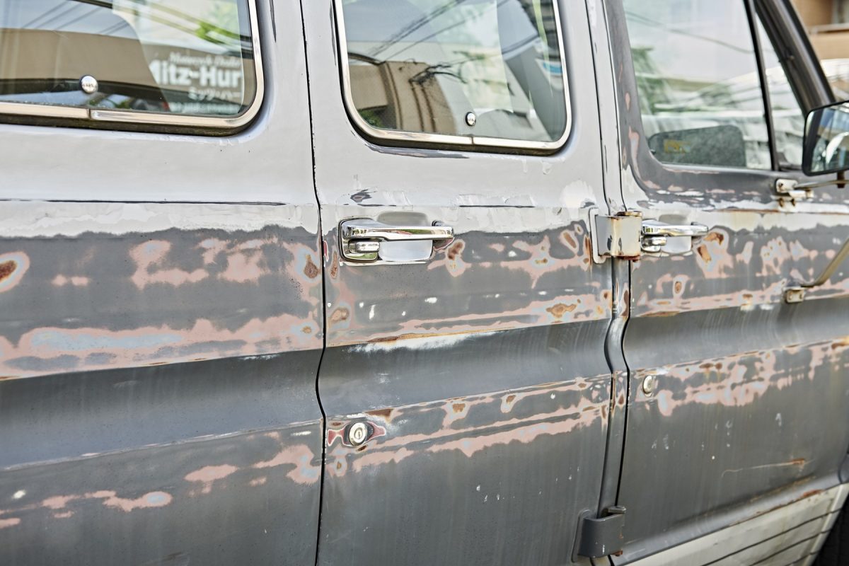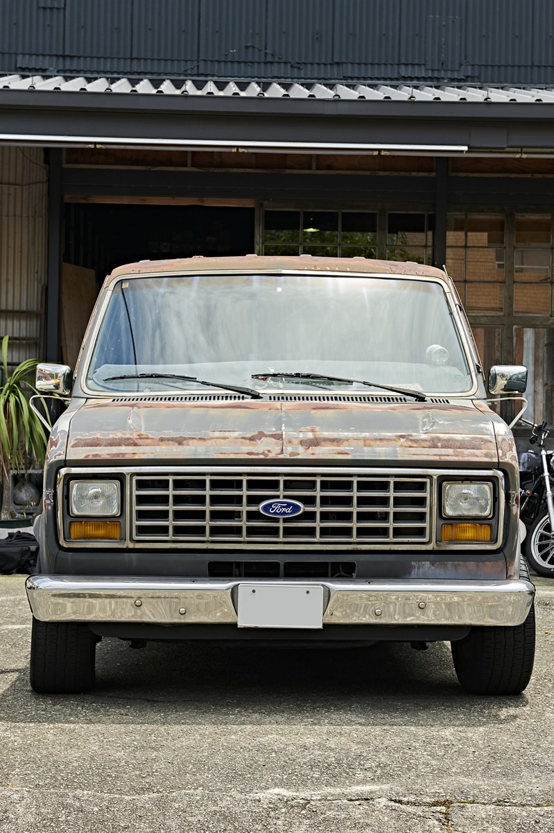 ECONOLINE 150のエンブレム痕も風合い抜群。この錆びた雰囲気はインダストリアルな空間デザインに通じるカッコよさがある。