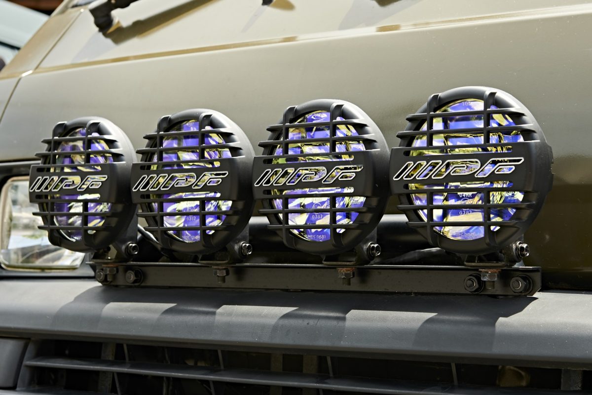 IPFのフォグは他車種用を転用。ステーはワンオフで制作した。こうするためにバン用バンパーの通称アヒル顔を選んだ。