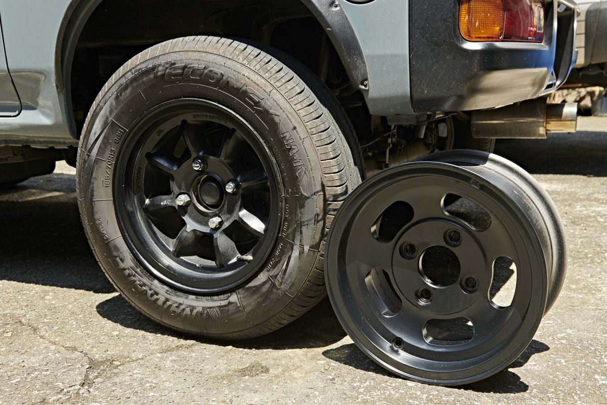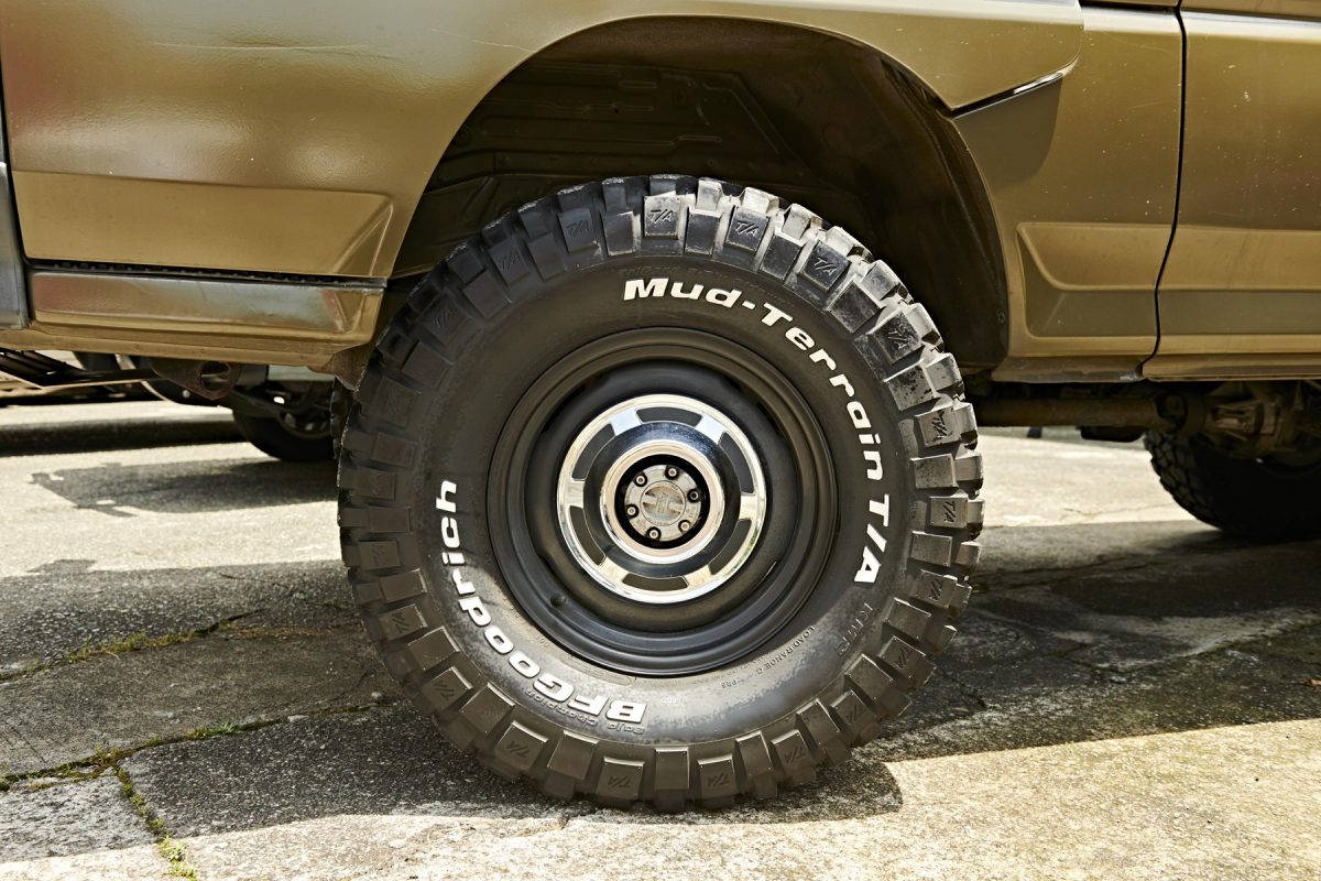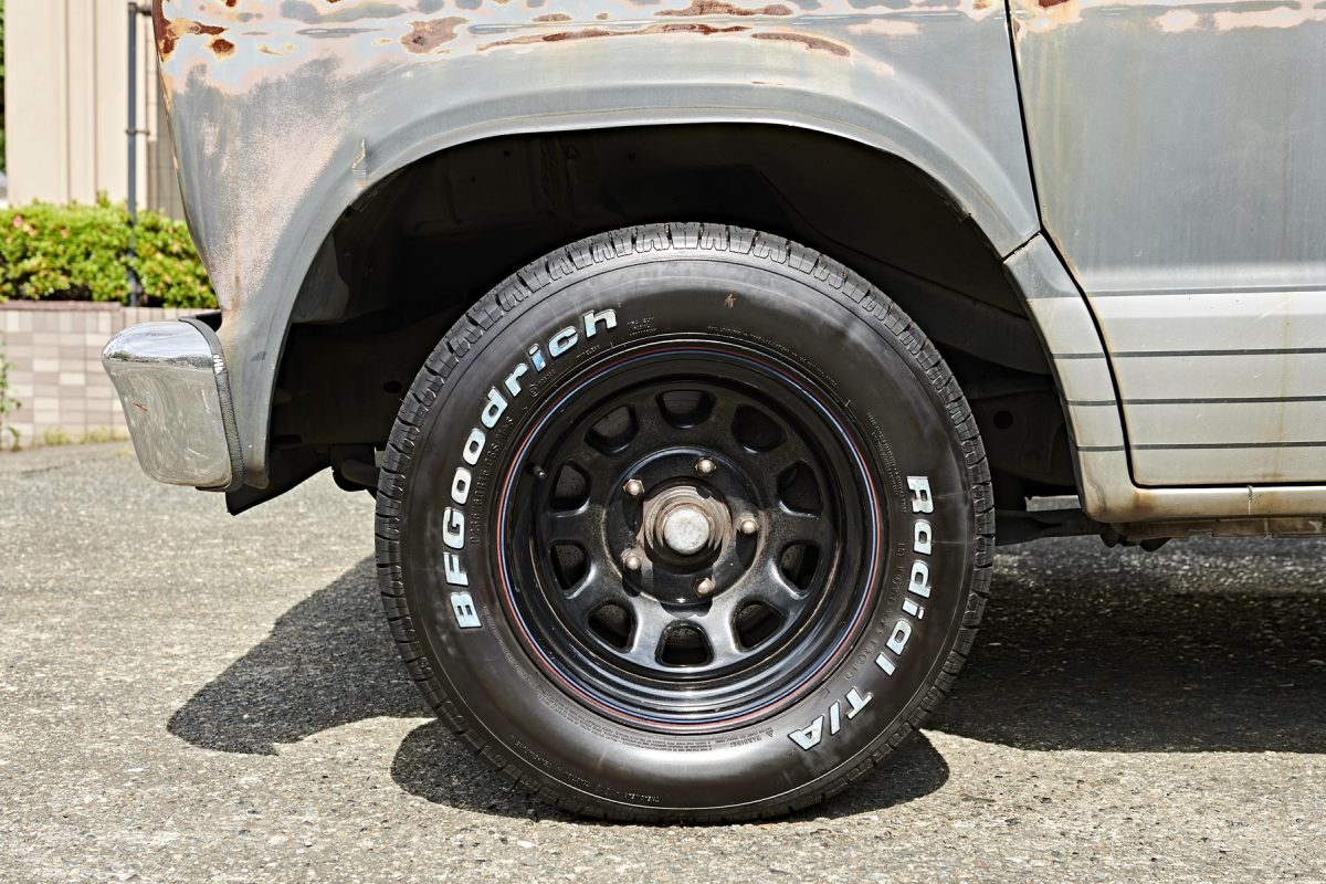 センターキャップを付けた鉄チンホイールにマッドテレーンタイヤを合わせるのは、いま注目のアウトドアスタイル。この年式のデリカによく似合う!