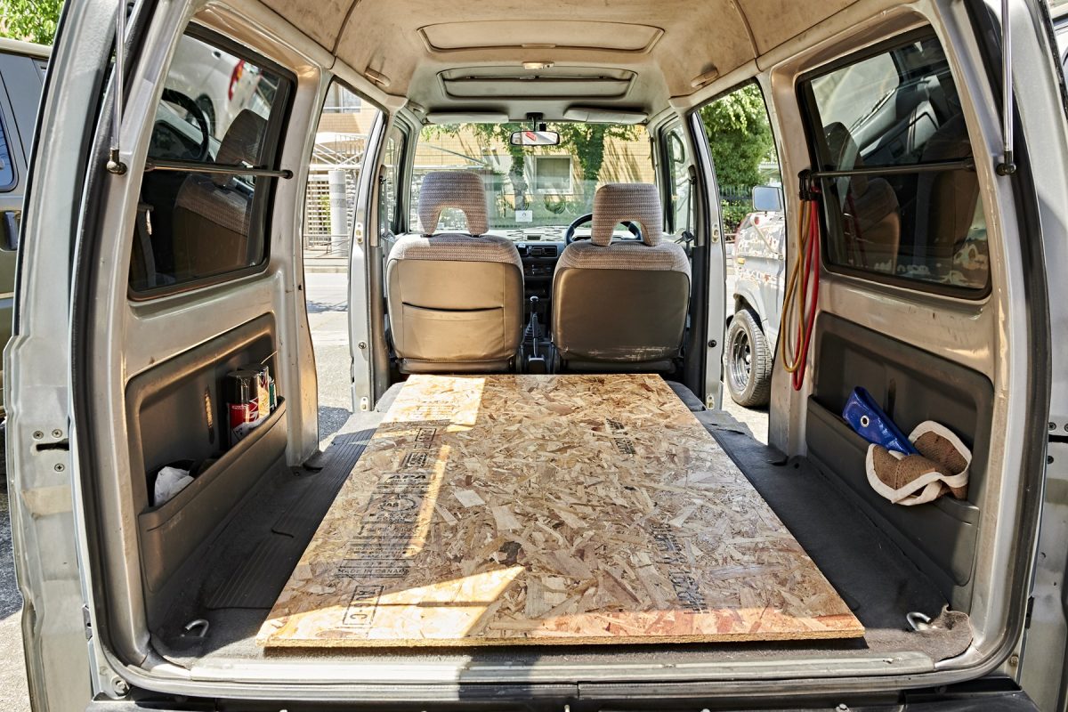 セカンド、サードシートはすべて取り払って完全なる積載車としている。建材など大きなものをこれに満載して運搬しているという。