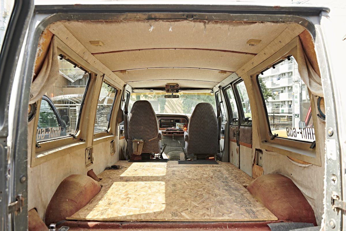 上山さんが仕事用にしたいクルマNo.1が、エコノラインだったという。そうして乗り継ぎ、この1台はなんと3台目! シルバーに赤×黒のストライプというのが嫌で、オールペンするつもりでサンドペーパーをかけて剥離したまま、ある時アメリカンバンの老舗店「ディーズクルー」のイベントで表彰されたことから、そのまま塗装せずに乗っているという。