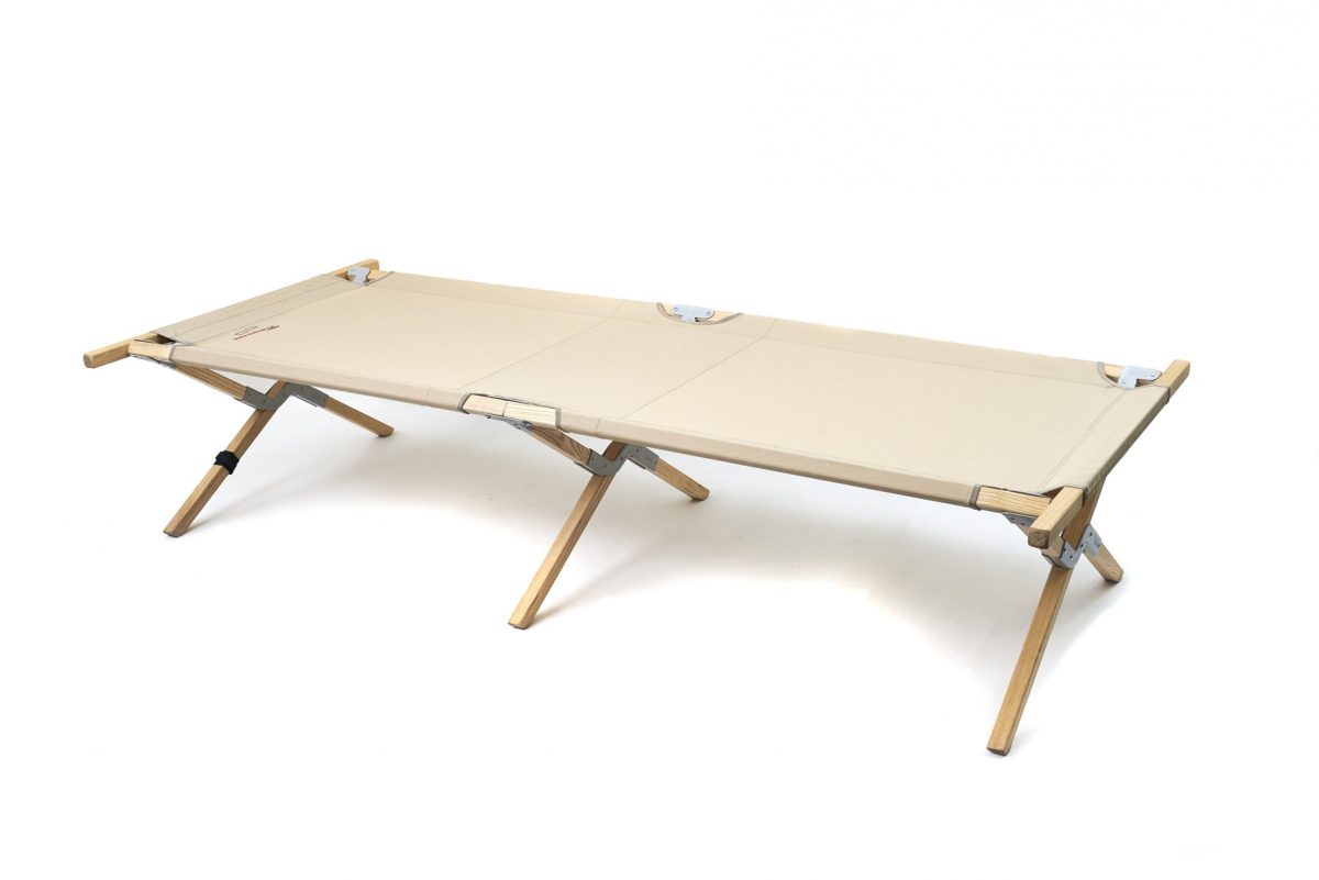 33㎜角の頑丈な堅木と600デニールのポリエステル生地により、複数人でベンチとして使うこともできるタフなコット。旧きよきアメリカのキャンプ用品を彷彿とさせる見た目と折り畳み式という点も魅力的。3万8500円(エイアンドエフTEL03-3209-7575)