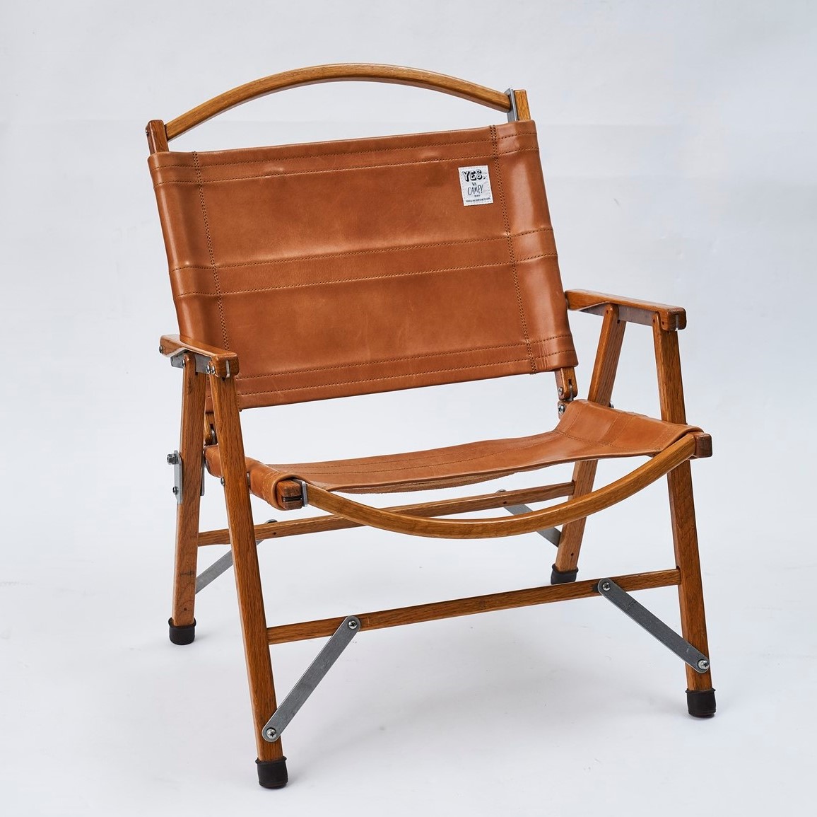 大きな一枚革の高級感のあるカーミットチェア。実はこれはカーミットチェア専門の張り替えキットで、革に変更するだけでキャンプサイトだけでなく、自宅でも映える存在になるというわけなのだ。2万2000円(ペレグリン・デザイン TEL03-6712-2821)
