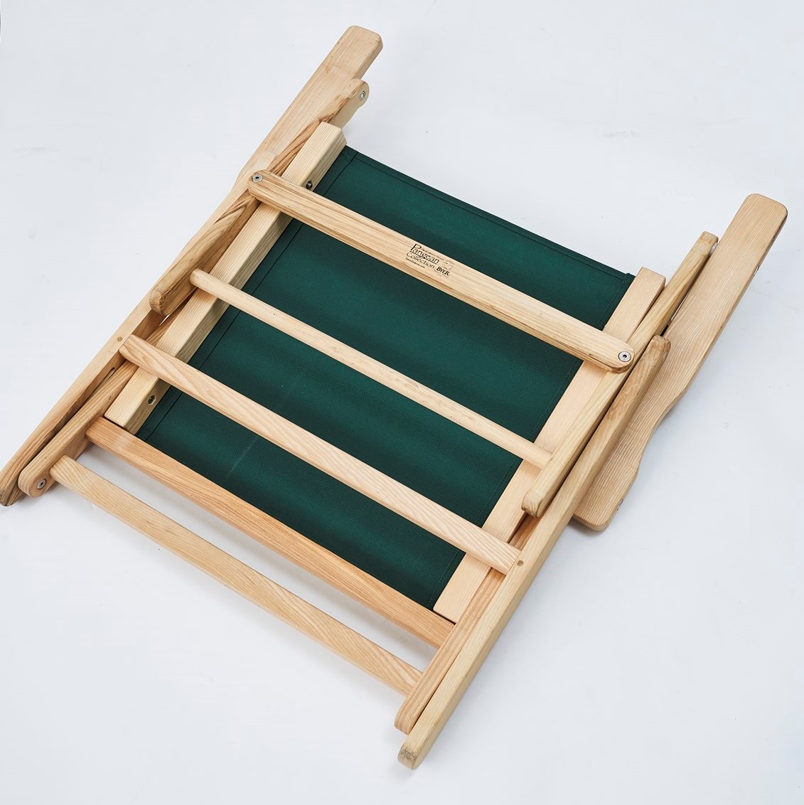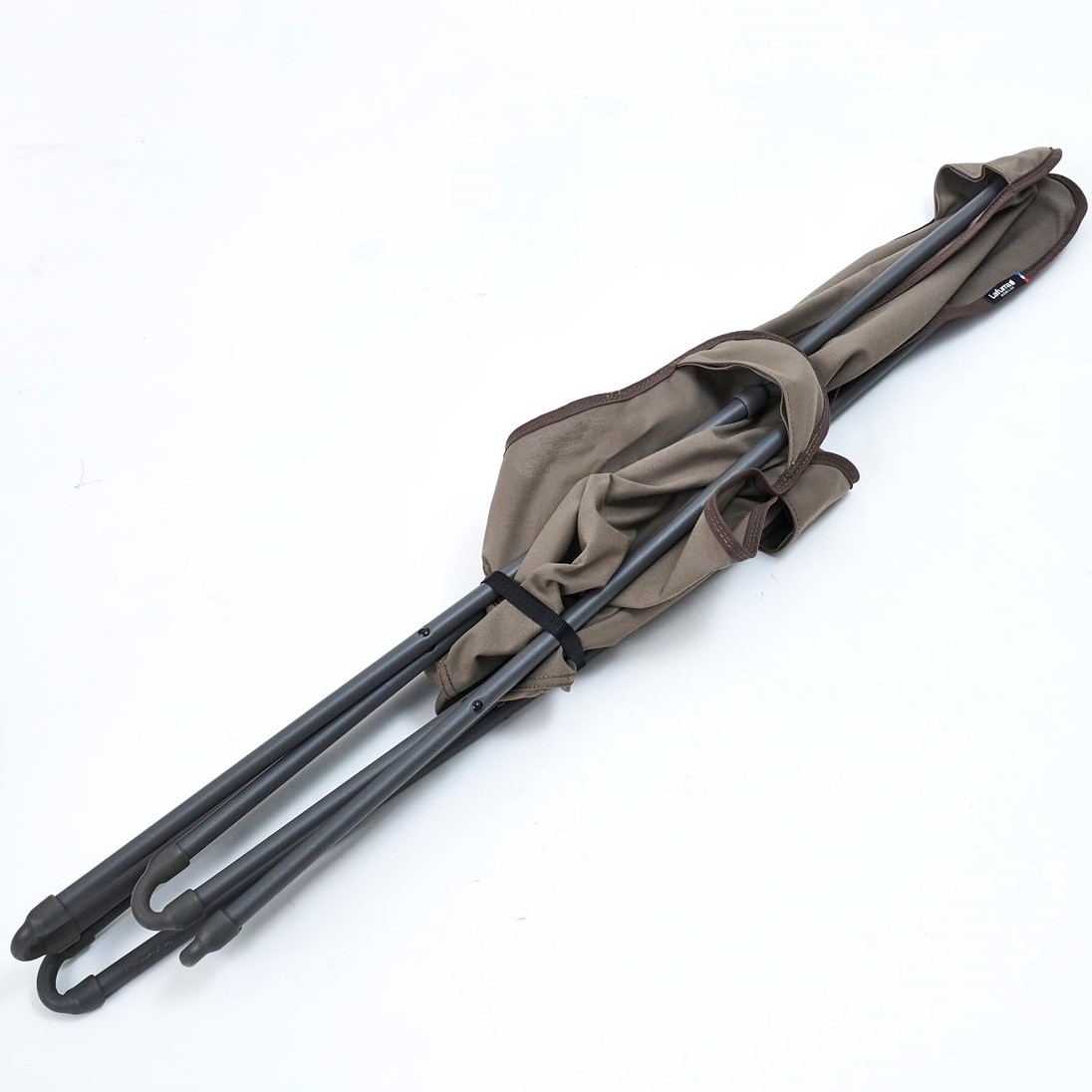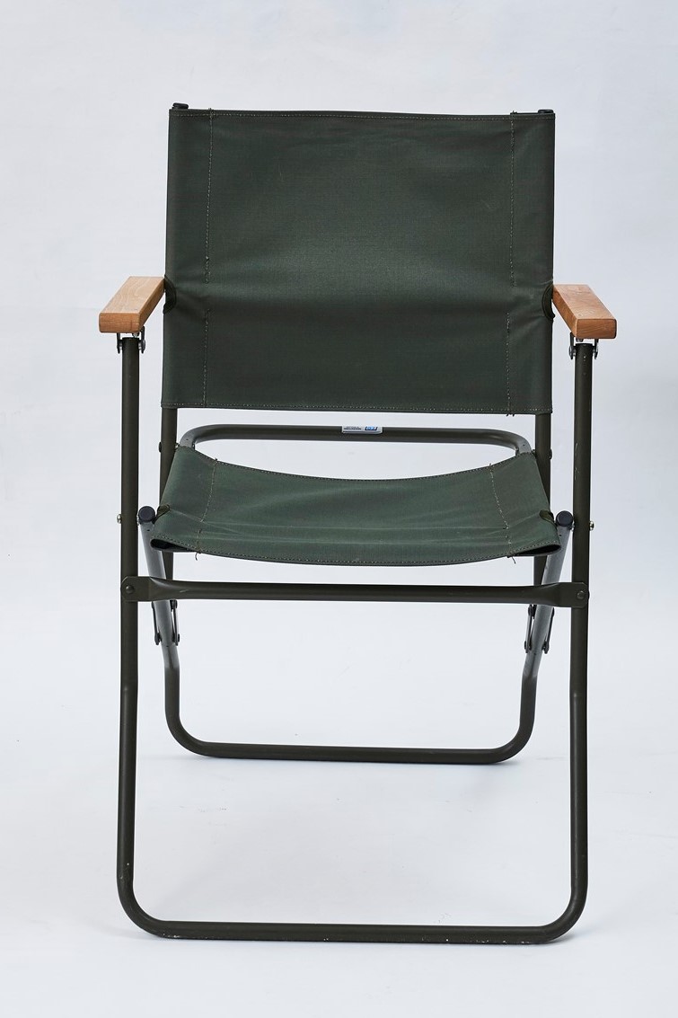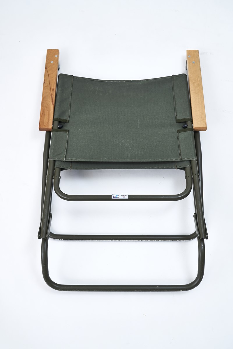 ワックスコートされたイギリス軍規格のリップストップ生地に、オリーブドラブで塗装されたアルミフレームが、イギリス軍に納入されていた本物の証。アームレストの木にはワックスがニスもかけられている。2万5850円(ピーエフエスパーツセンター TEL03-3719-8935)