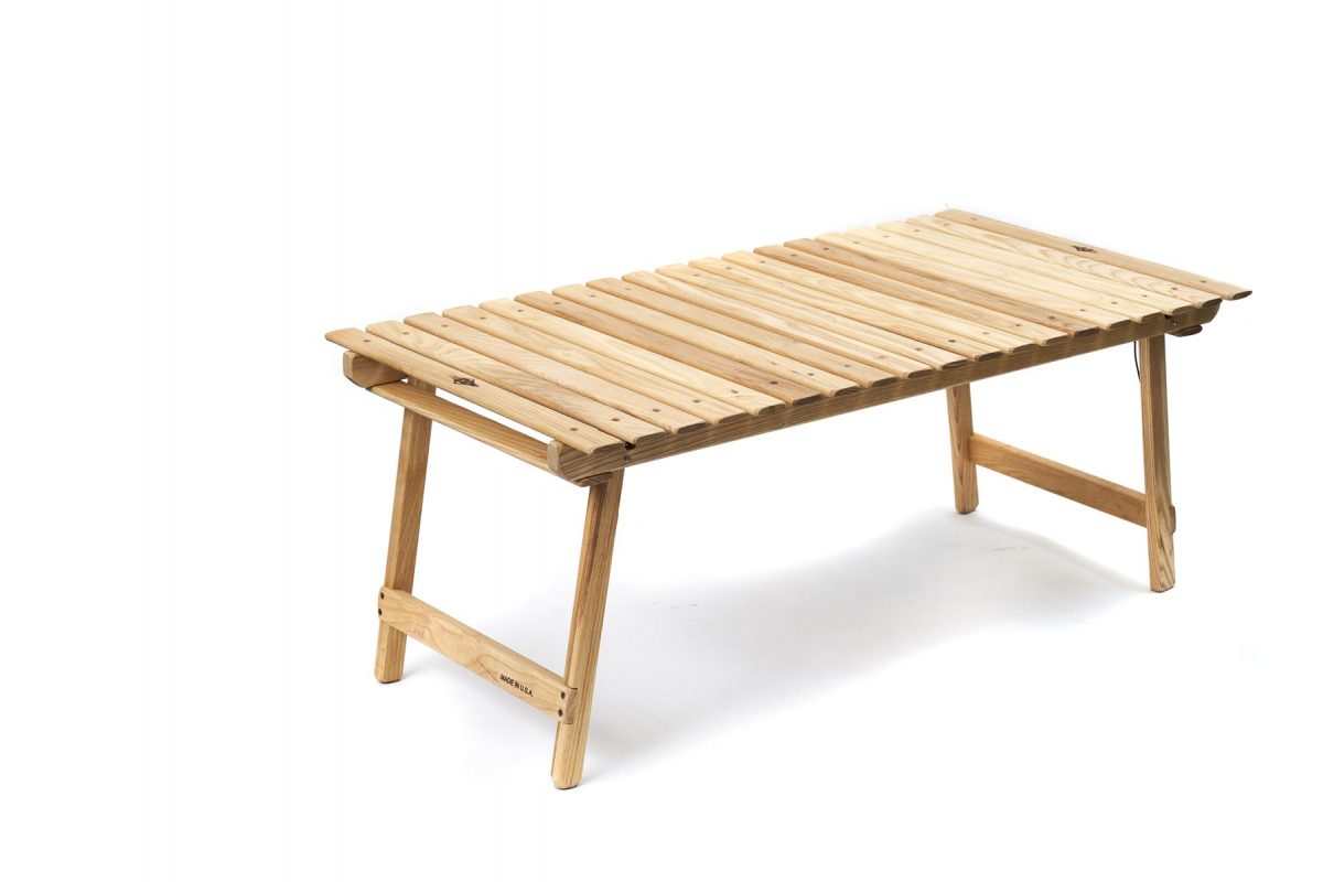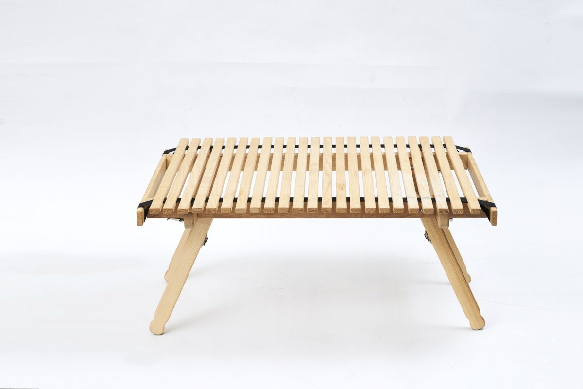 天板をクルクルと巻いてコンパクトに収納できる、ホワイトアッシュ材を使ったテーブル。パンジーンコレクションのもので、ヘリノックスチェアなどと合わせやすいロータイプで、自宅ではカフェテーブルとしてもオススメ。2万4200円(エイアンドエフ TEL03-3209-7575)