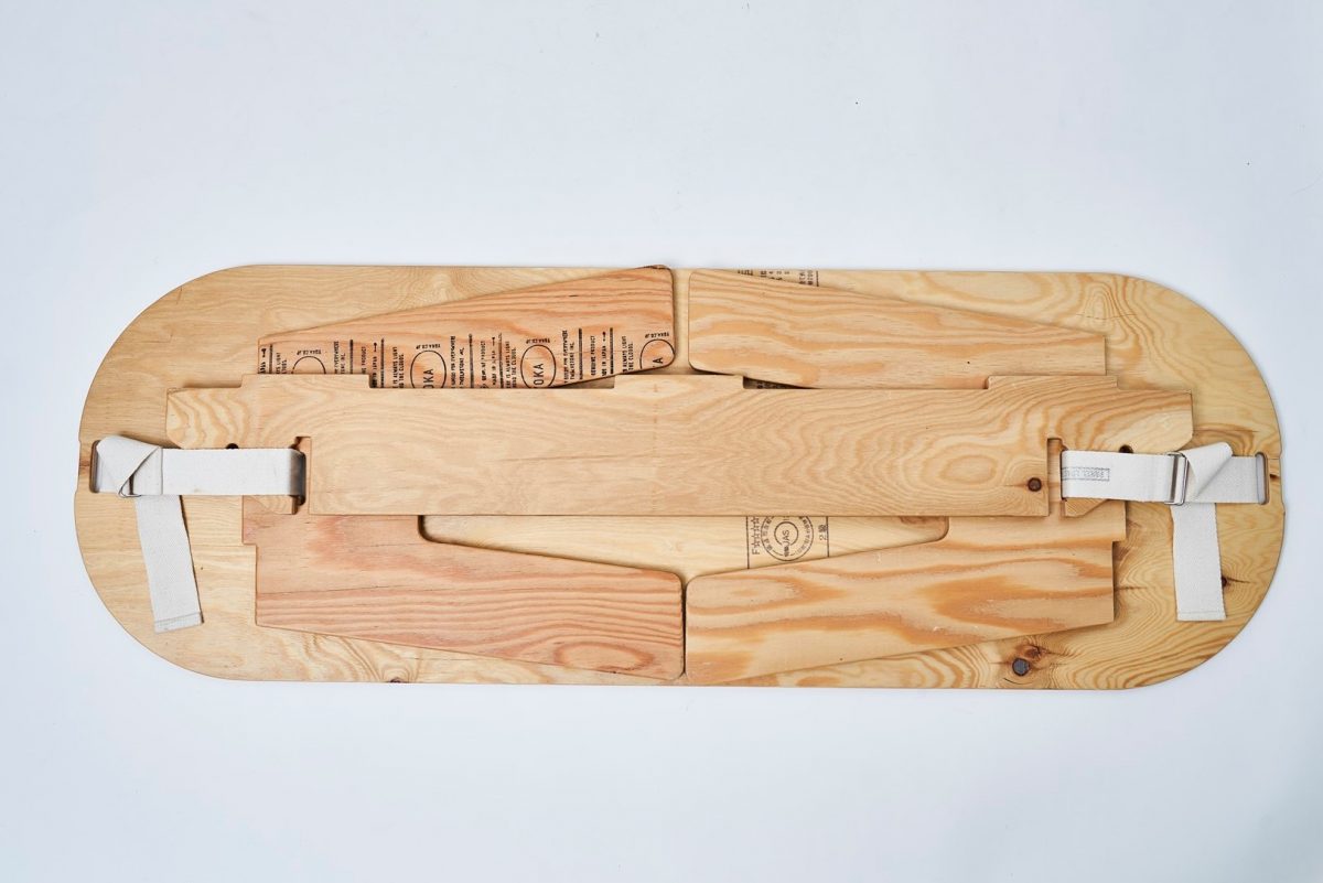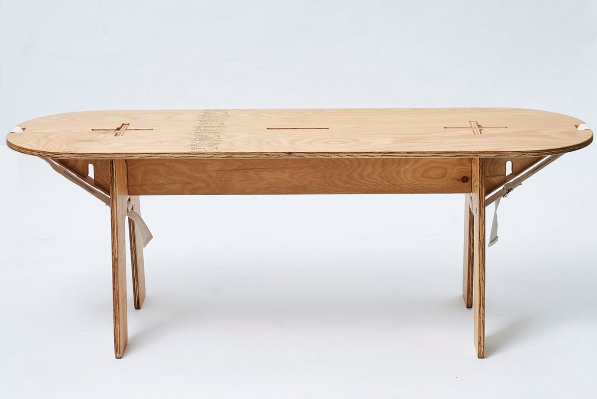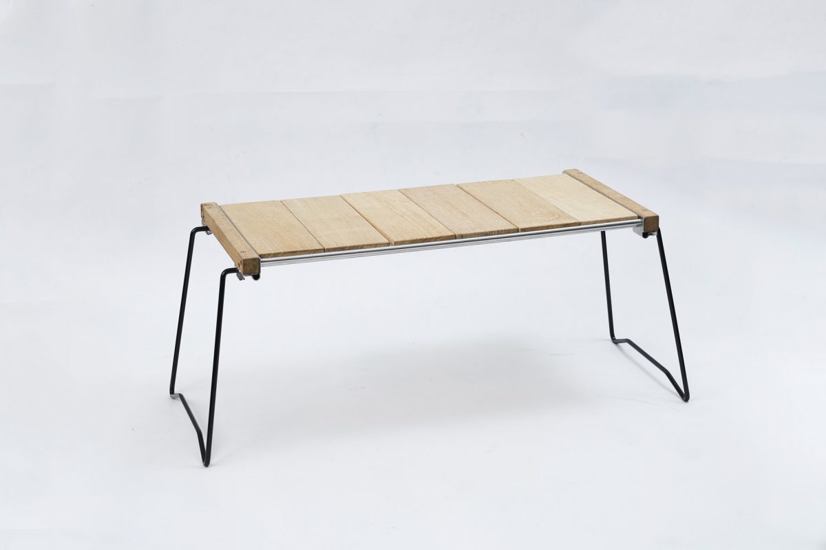ヨカの代名詞である針葉樹合板を使った組み立て式のテーブル。足を取り外して収納すると、スノーボードを抱えるように持ち運び可能。自宅でコーヒーテーブルとしてもオススメ。2万4200円(トゥエルブトーン TEL03-5708-5300)