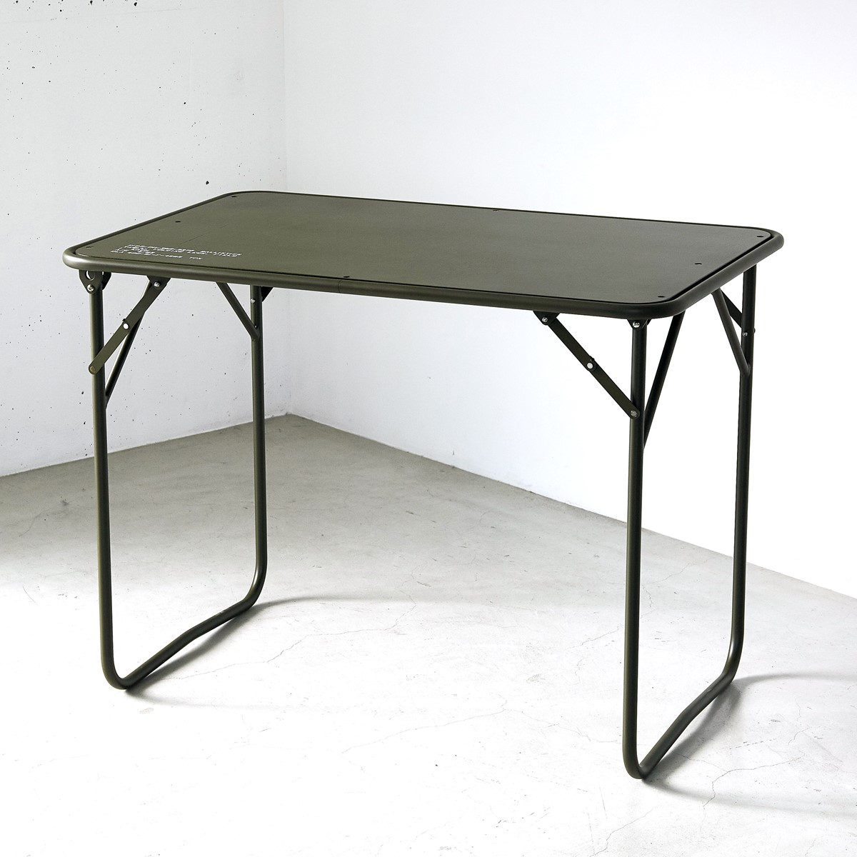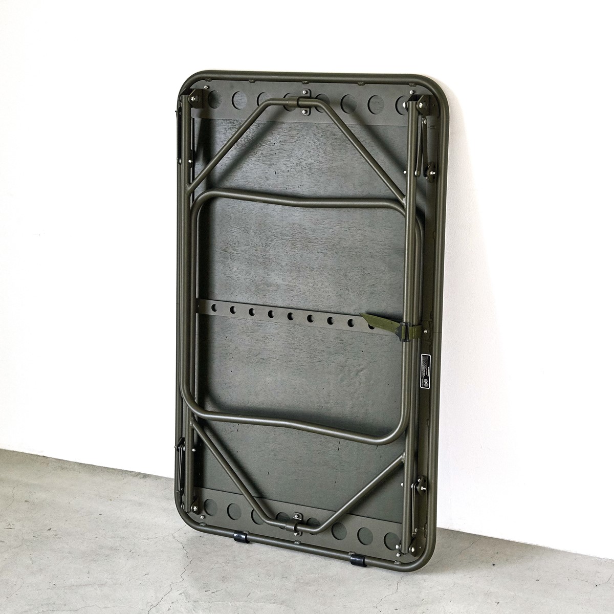 オリーブドラブで塗装したアルミフレームとラワン材の天板を組み合わせたテーブル。ローバーチェアに合うように設計したバリスティックスのオリジナルプロダクツで、フレーム裏は飛行機同様の肉抜きで軽量化している。6万3800円(バリスティックス TEL03-5766-5615)