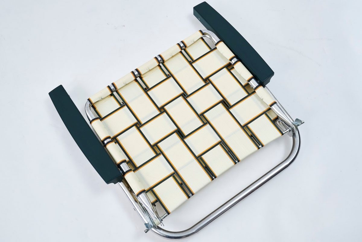 1960年代のアメリカを象徴する、どこにでもあったカラフルな折り畳みチェア。それをアメリカ製で復活させ、当時らしい配色のウエビングベルトはパシフィック・ファニチャー・サービスの別注で再現した。9350円(ピーエフエスパーツセンター TEL03-3719-8935)