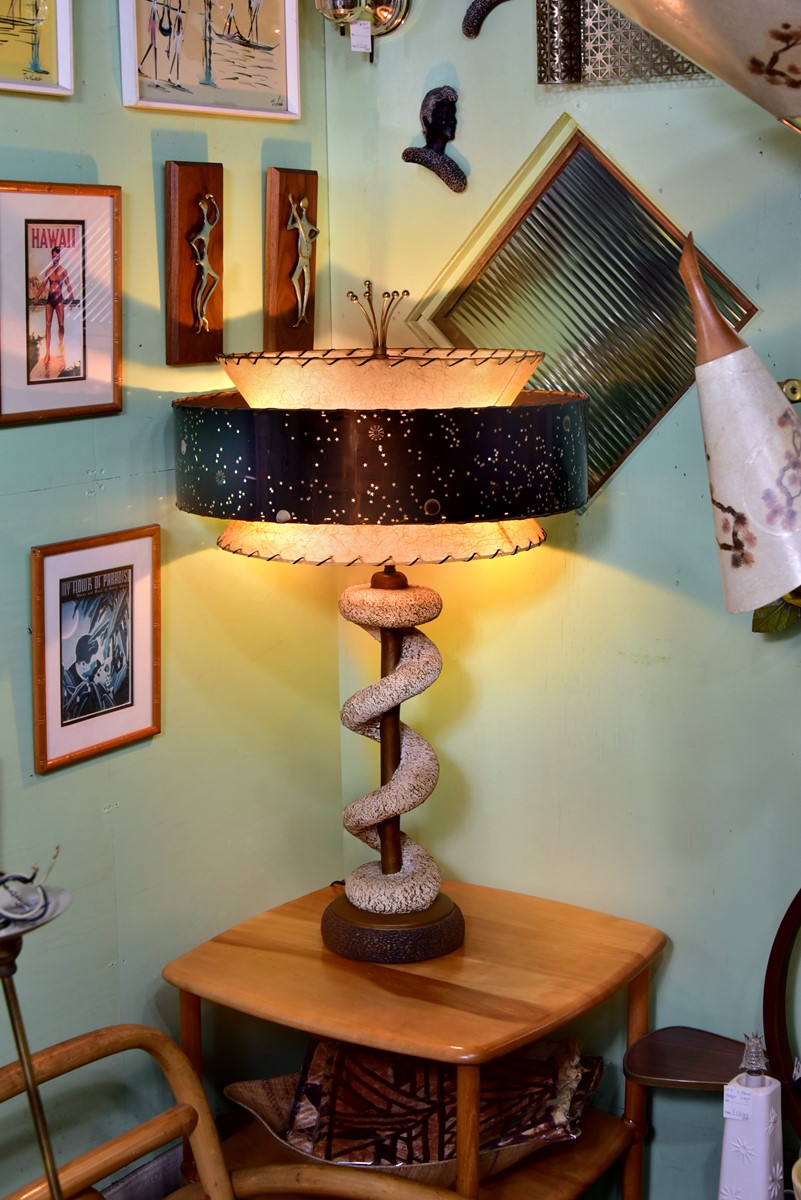 メーカー不明ながら1950年代製でも珍しいトリプルシェードの凝った作りを持つシェードランプ。上部にあるシェードストッパーはアトミックの意匠となり、シェードには星のデザインが落とし込まれている。すべてオリジナルで残るのは希少。相場は7〜10万円ほど。