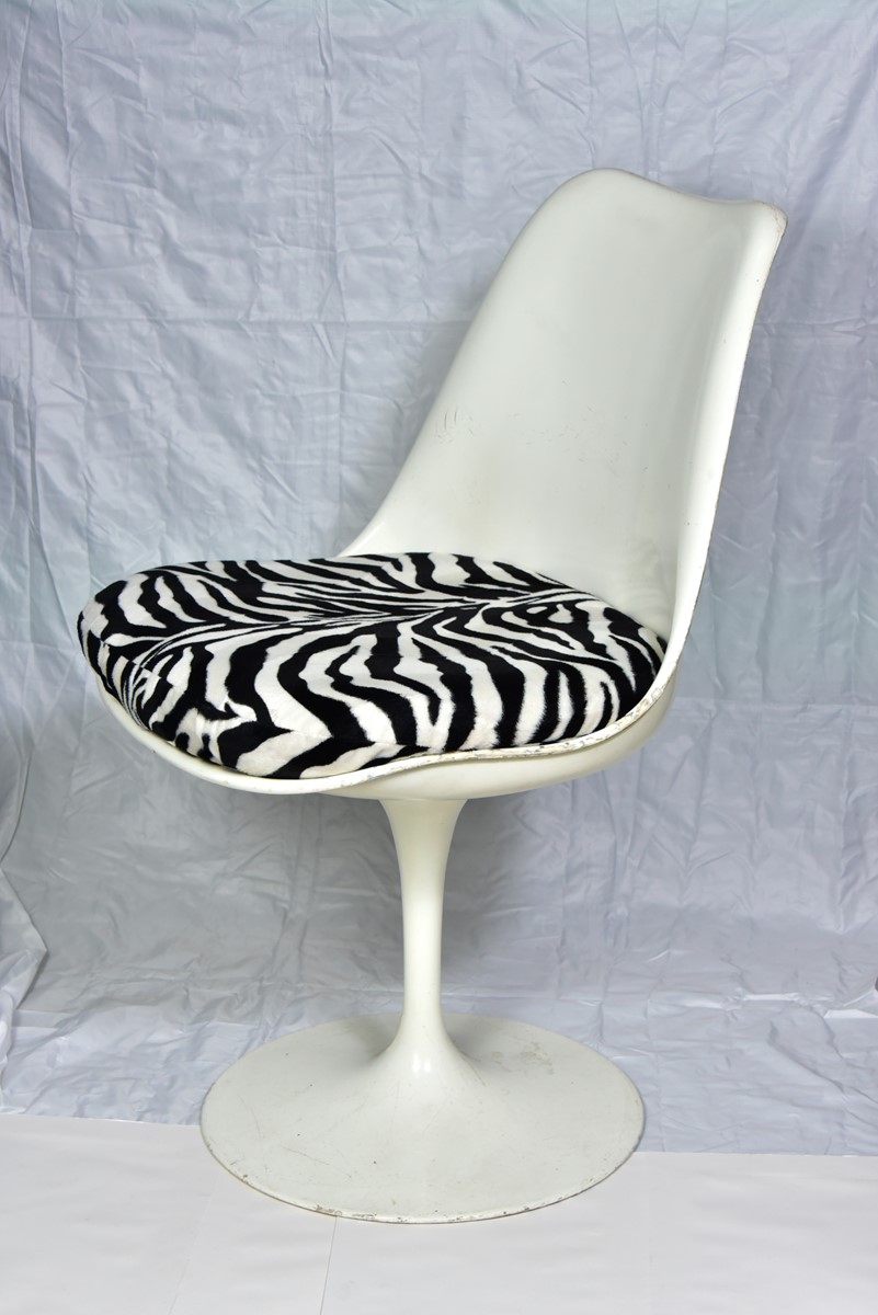 建築史に名を残すヘルシンキ出身の建築家、エーロ・サーリネンがデザインしたチューリップチェア。グラスファイバーを素材に優雅な曲線デザインが特徴。消耗品のシートはゼブラ生地に張り替え済み。状態によるが相場は3〜5万円。