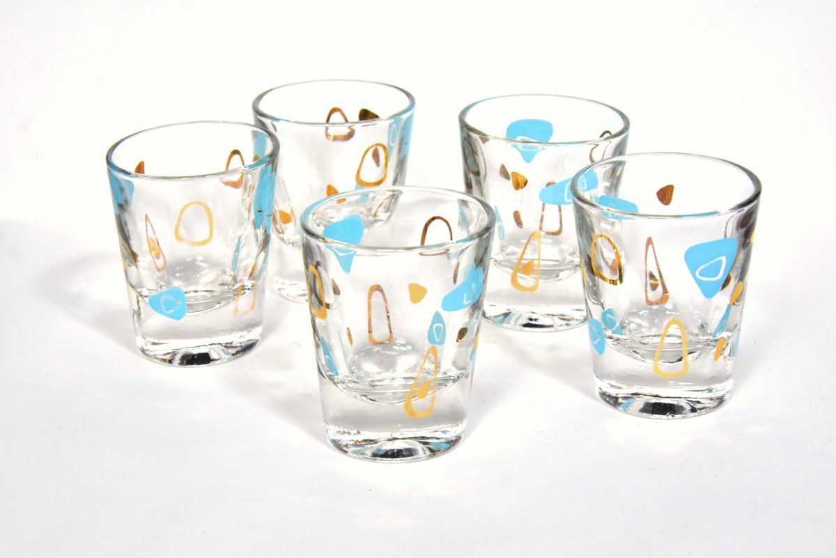 フェデラルグラス社が’50年代に販売したキドニーシェイプシリーズのショットグラス。当時の流行色であるターコイズブルーとゴールドを組み合わせている。またゴールドが経年とともに抜けやすく、しっかり残るものは少ない。ひとつ3000〜5000円ほどの相場観。