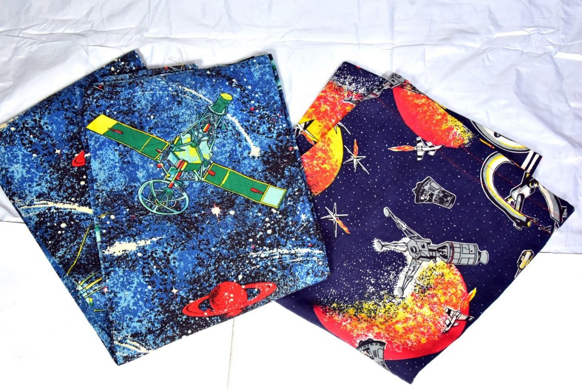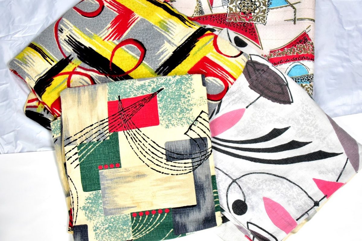 アトミック柄など幾何学模様は’50年代に作られたものが多く、’60年代になるとアポロ計画などの影響からか宇船など描いたものが多くなる。色や柄は数多あるが黒ベースが人気。物によるが1mあたり1〜1万5000円が相場の目安。