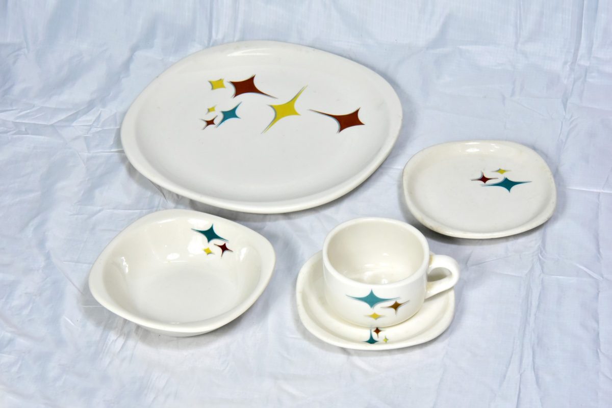 1871年に創業したシラキュースチャイナ社。スペースエイジデザイン黎明期らしい星をイメージした意匠を落とし込んだ「ジュビリー」というシリーズ。ディーカップやディナープレート、ケーキプレートなどセットでそろうのは希少。6客セットの価格で15万円ほど。