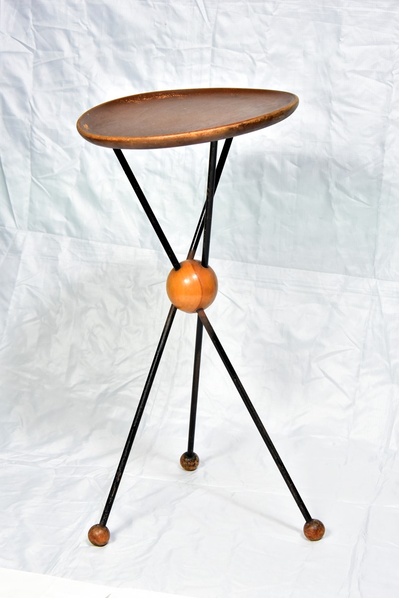 ウォルナット素材を使い、ウッドボールとアイアンを組み合わせてデザインされたアトミック(原子)テイストの脚が特徴。ブランドやデザイナーは不明だが、希少価値の高いヴィンテージサイドテーブルだ。3〜5万円が相場だという。