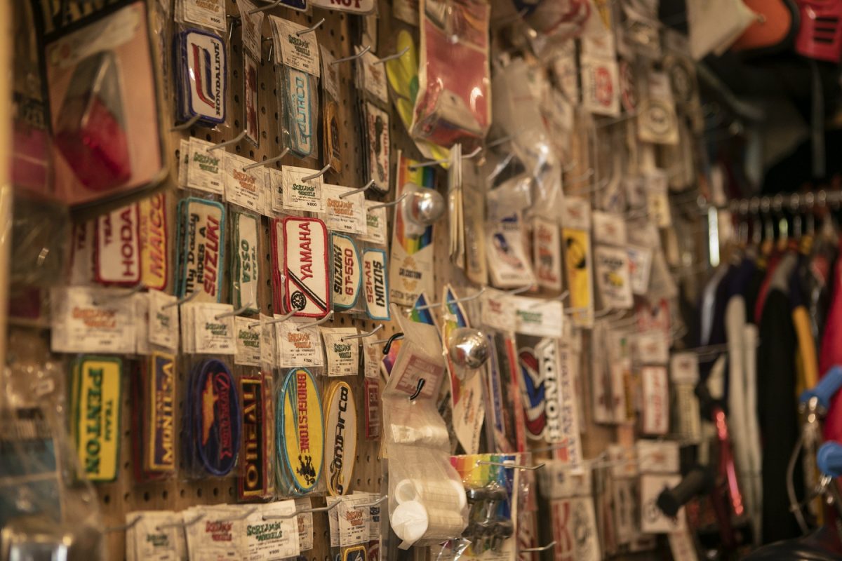 店内にはヴィンテージのカスタムパーツが所狭しと吊り下げられている。モーター系のメーカーの旧いステッカーやパッチを豊富に揃えているのも魅力だ。