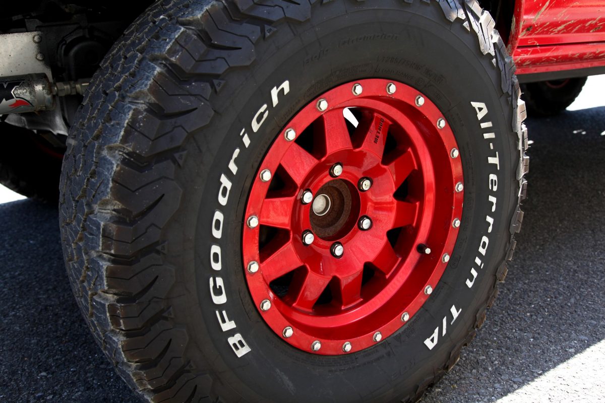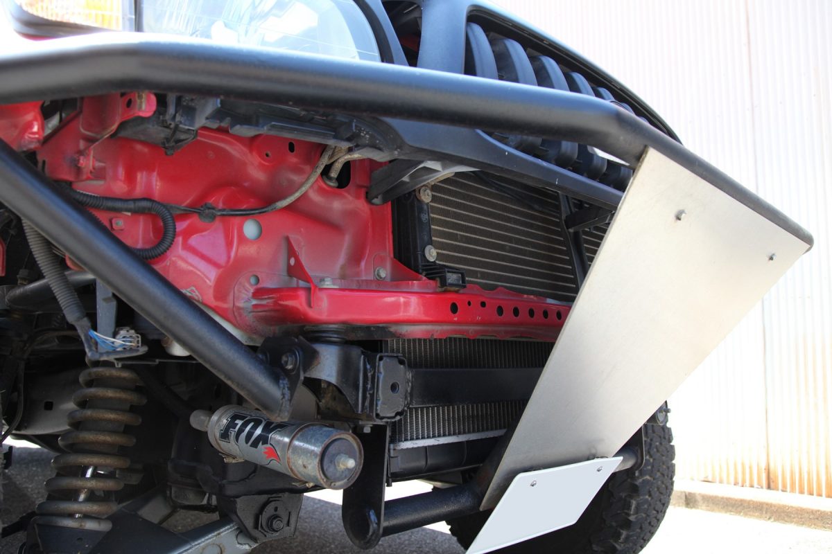 FRP製のブリスターフェンダーを装着し、タイヤの取り付け位置を外側に広げ、オールテレーンタイヤを装着。大きくジャンプしてもしっかり着地できるサスペンションとショックアブソーバーを装備する。また、ジャンプの着地時に“顎” をぶつけないように純正バンパーを外し、鉄パイプで前面をガードして分厚い台形の鉄板を施したプレランナーバンパーを装備した顔つきも大きな特徴だ。