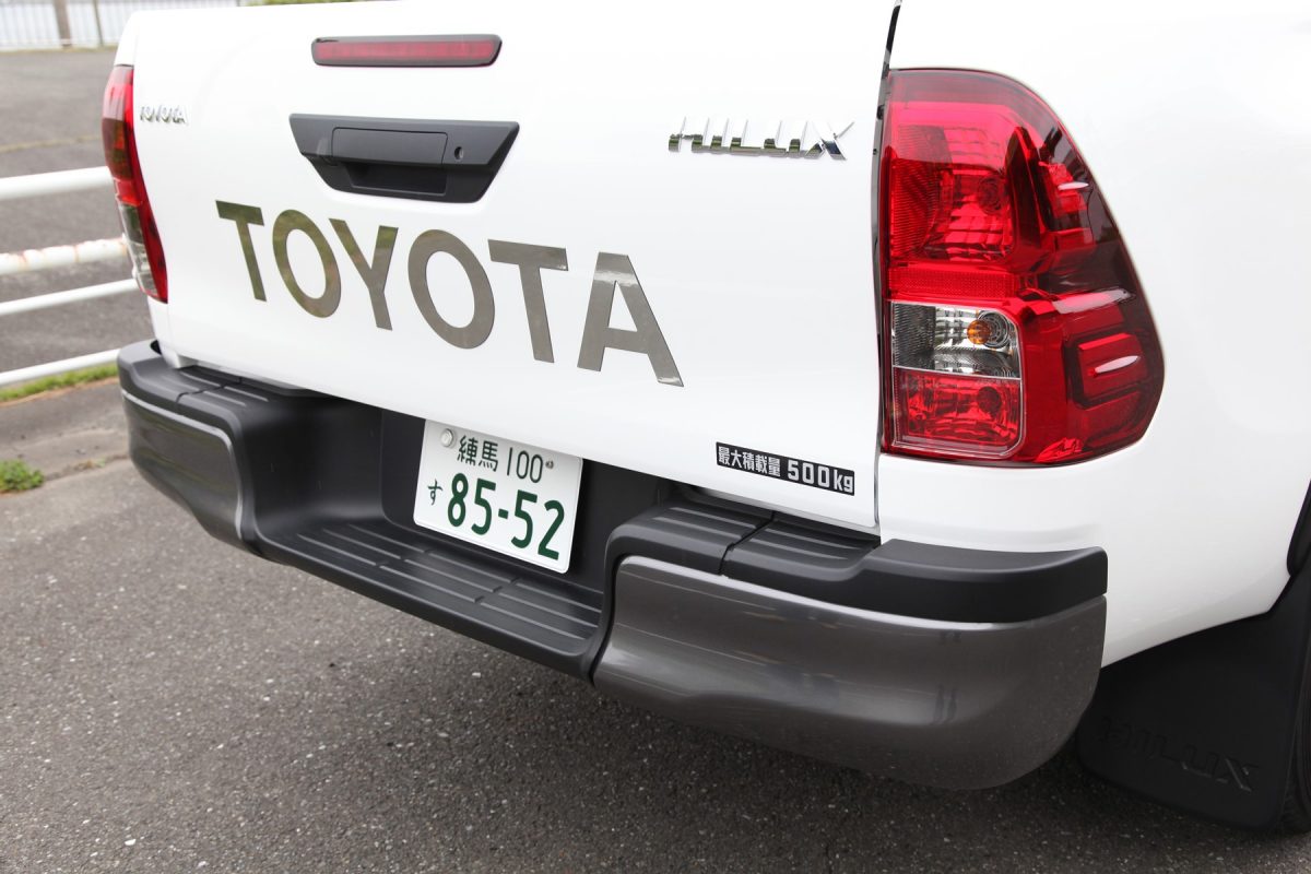 荷台のリアゲートにあるクラシカルなTOYOTAの大きなロゴは、オプションで用意されているもののひとつ。荷台は最大積載量500kgで、開口幅1380㎜・荷台高480㎜もあるので、大型バイクも軽々と積載可能だ。