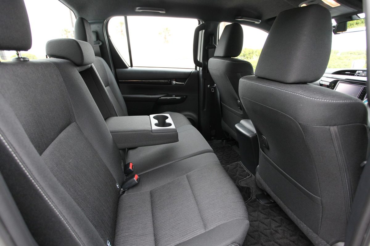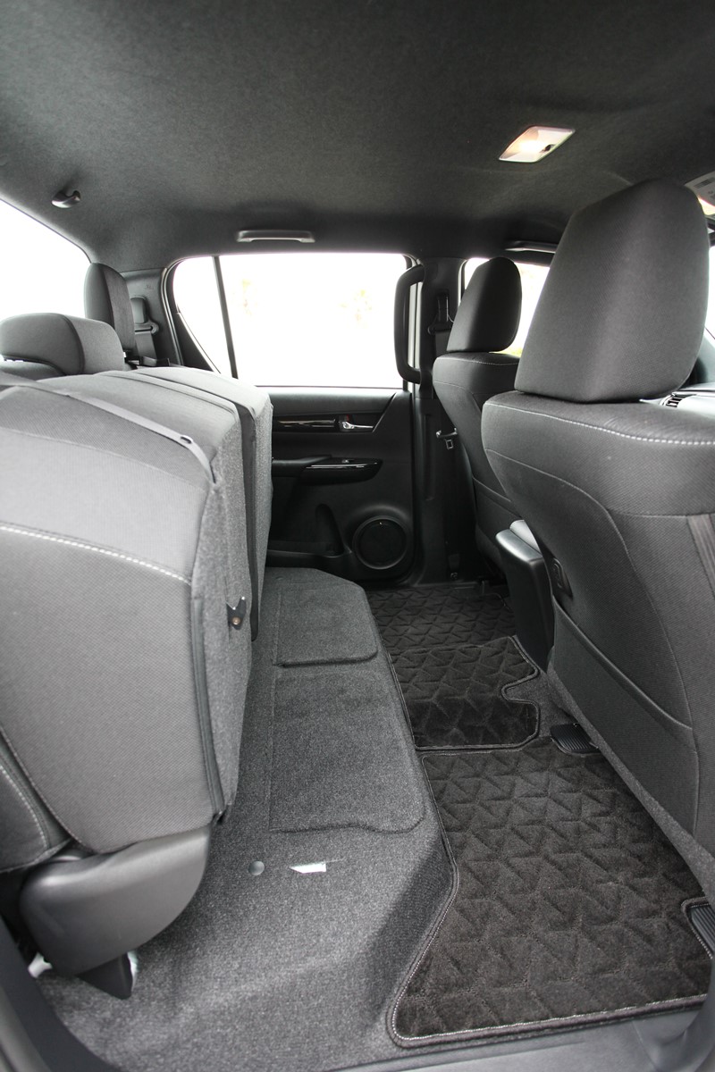 ダブルキャブのため、4枚ドアの5人乗り。リアシートはセンターコンソールも装備し、左右別々に跳ね上げることもできるため、用途に応じて様々なシートアレンジが可能。ピックアップスタイルのクルマとは思えないほど、室内空間にゆとりがある。