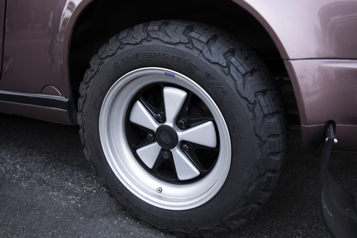 肉厚なタイヤを装備しているだけでなく、ショックによって4インチのリフトアップをしているので、いわゆるポルシェとは明らかに違うイメージになっている。ジープなどのオフロードカーほどスパルタンではなく、本来のスポーツカーとしてのイメージを残しているので、走破性を高めつつもしっかりとスピードも楽しめるイイトコ取りのスタイル。リアビューはウイングを装備しているが、タイヤハウスにマッドガードを装着してオフロード車のイメージを高めている。