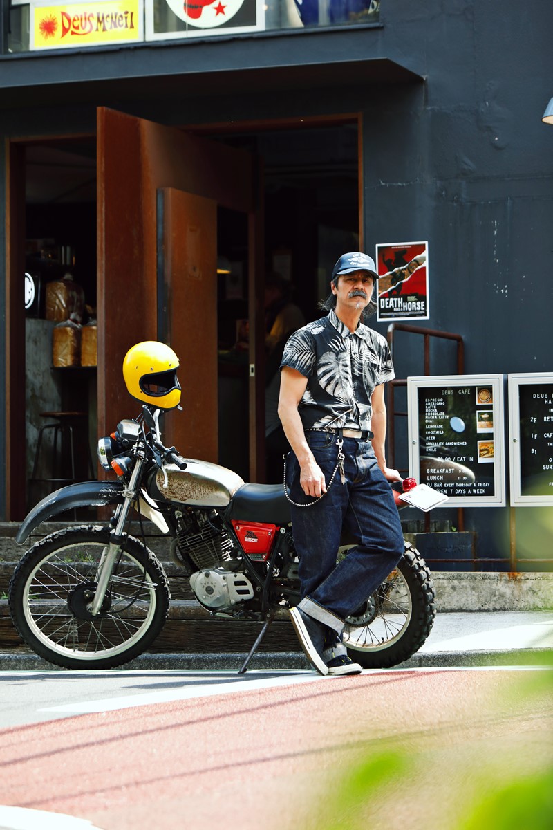 「このバイクを選んだ理由は、なんと一目惚れです。250㏄のエンジンに対して車体が大きく、自分は身長があるから小さな車体のバイクは似合わないと思ったんです。デウス エクス マキナ 原宿で働く上で、ブランドの世界観を意識し、そして日本のオフロードの旧車が好きなのでこの車両を選びました。