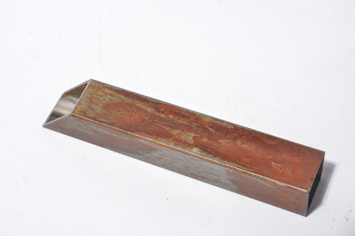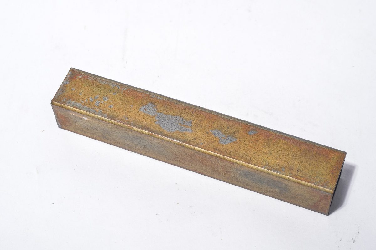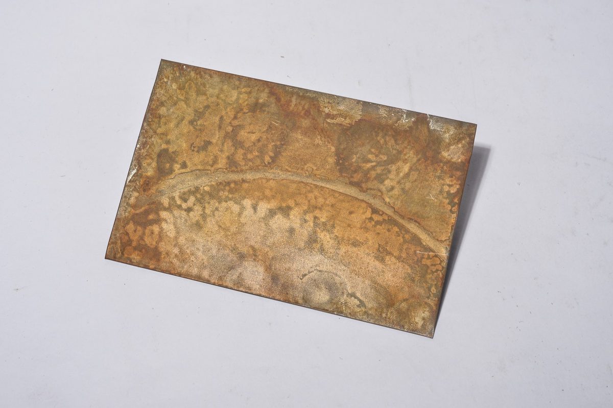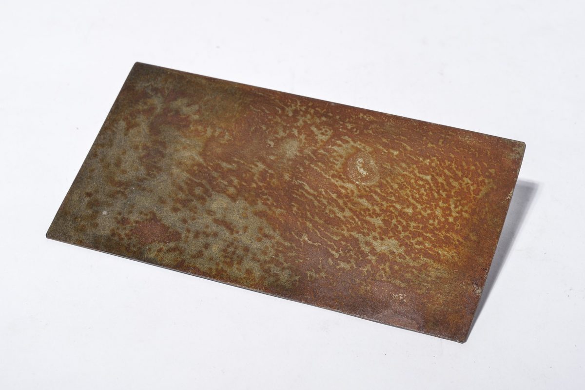 酸化剤に1時間漬け込んで乾かしたものと、半日かけて2回漬け込んで乾かした両サンプル。1時間の方も錆びてはいるものの色は浅い。対して半日かけた方は錆びの濃淡や深みが増し、より味わい深い仕上がりに。