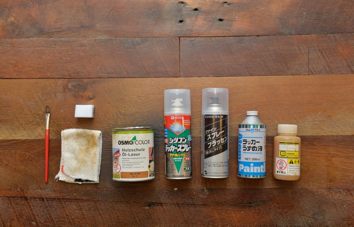 筆、ラッカーシンナー(表面の脂分が取れるもの。パーツクリーナー等でも可)、サビ促進剤(なければ酸性クリーナーや食塩水でもOK)、塗料(絵の具でもOK)、黒染めスプレー(染料の粒子が細かく素材に染みこむもの)、クリアのシリコンラッカースプレー(トップコート用の固定剤。水性でも可。)、激落ちくん(スコッチブライトでも可)、乾いた布雑巾