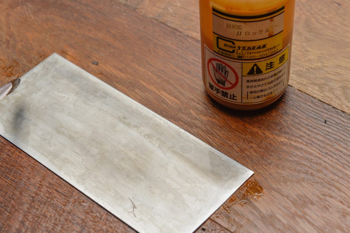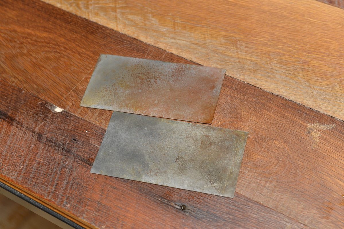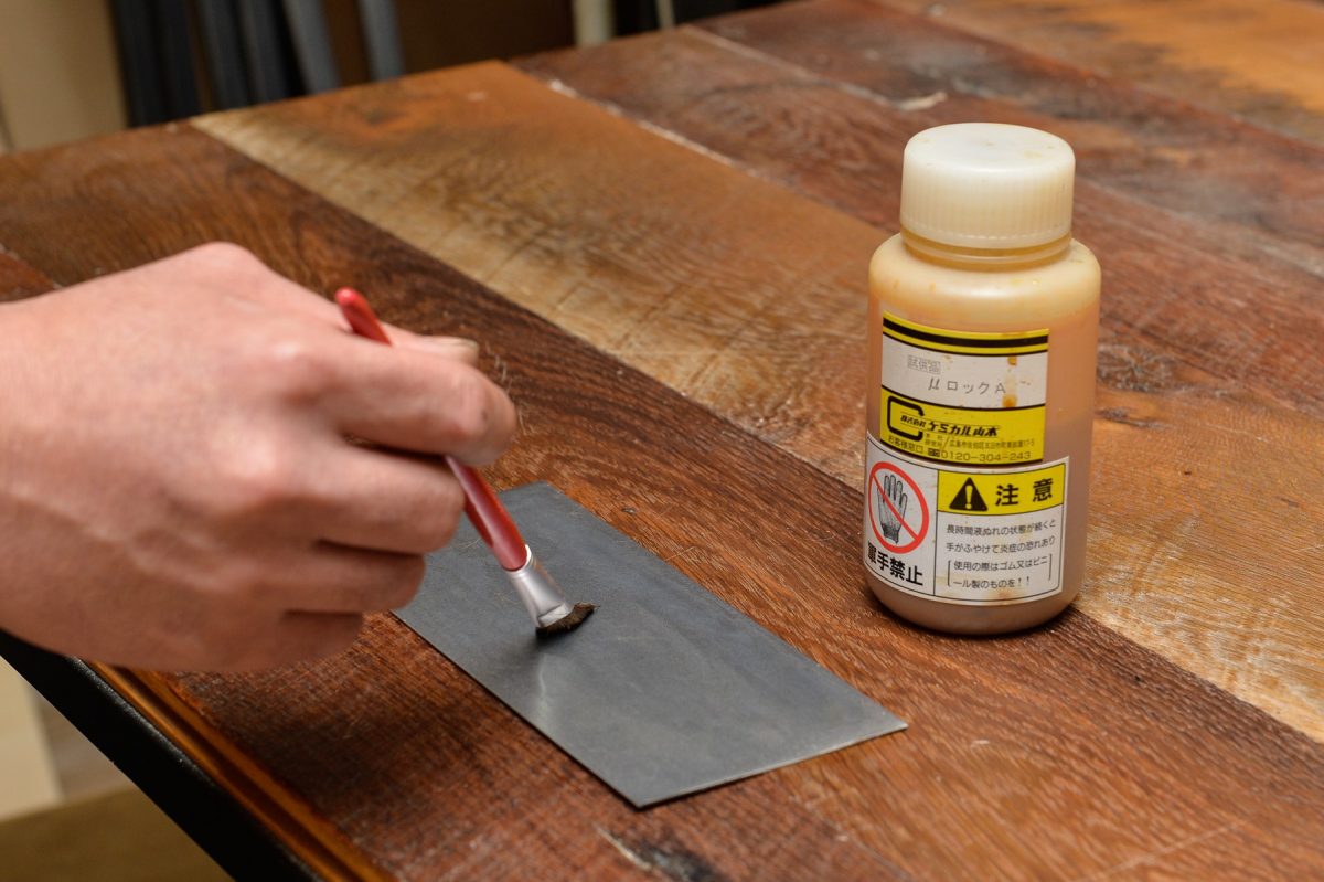 実際に鉄を酸化させるエイジング方法。酸化剤に漬ける時間と回数で雰囲気もかなり異なってくる。よりリアルな風合いを求めると、酸化させるのにある程度の時間はかかるが、その分より本物に近い雰囲気を作り出せる。
