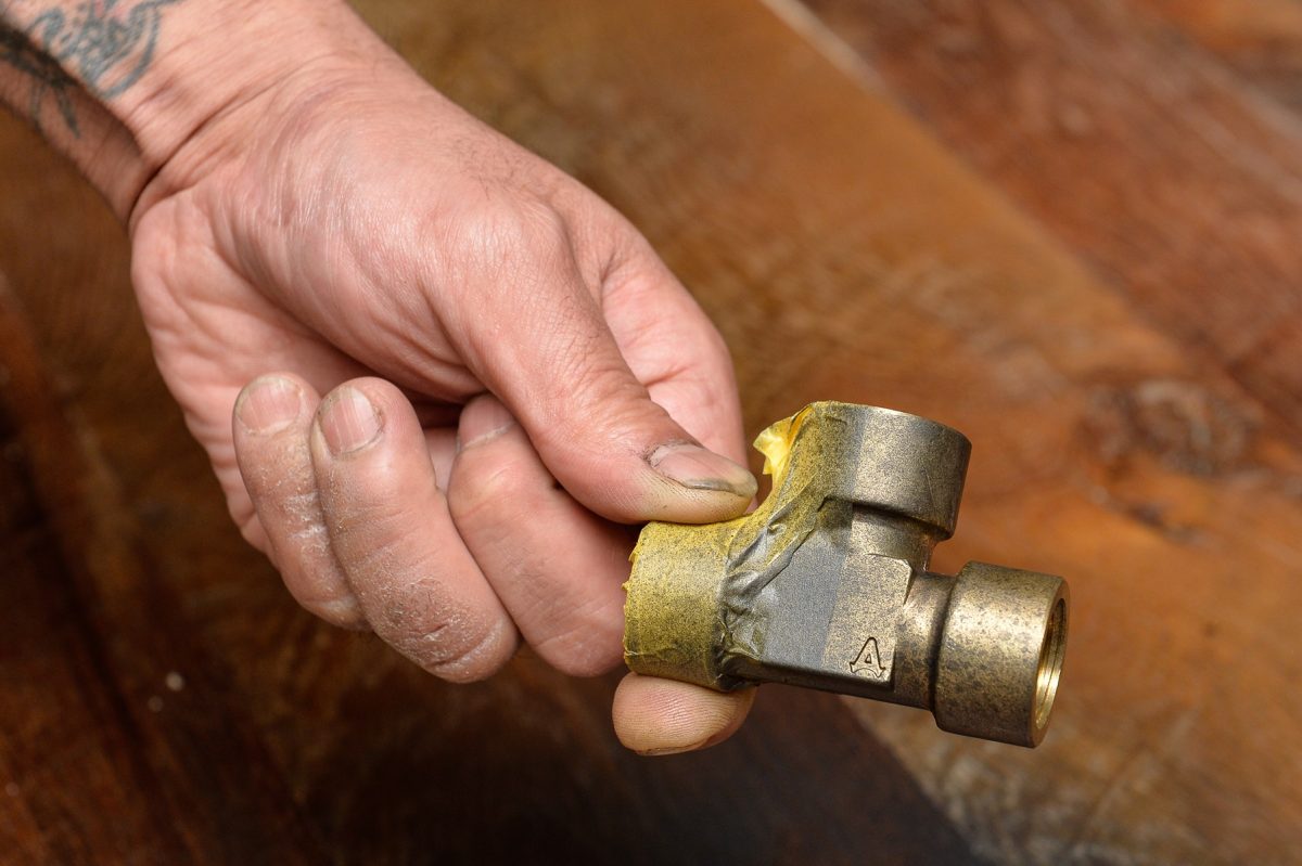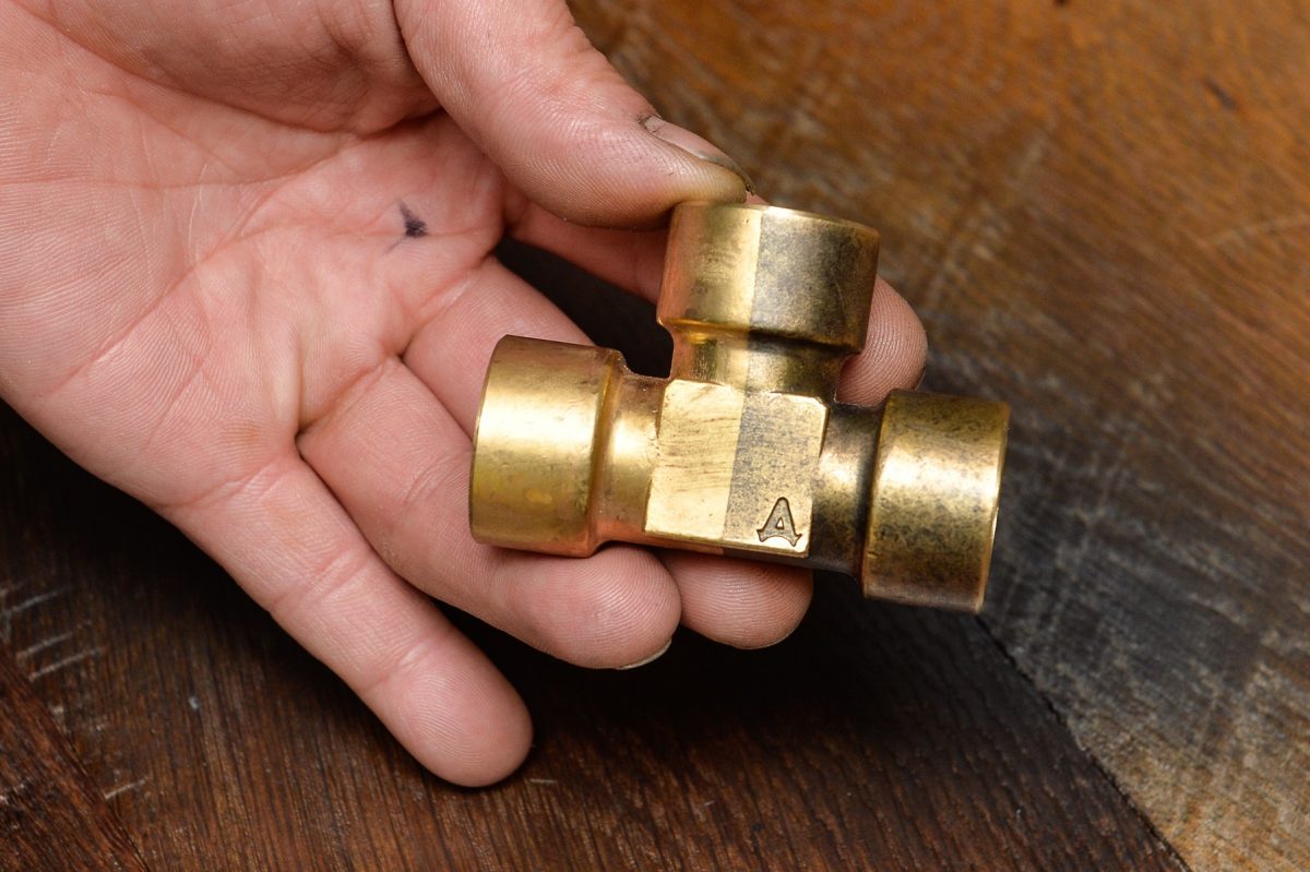 真鍮は水分に弱く、触って手垢や汗などがつけば、湿気や汗の影響で変色が進行していき、燻し銀のような雰囲気になる。黒染め剤をうまく使って、手が触れる部分と触れない部分をいかに表現するかがポイント。