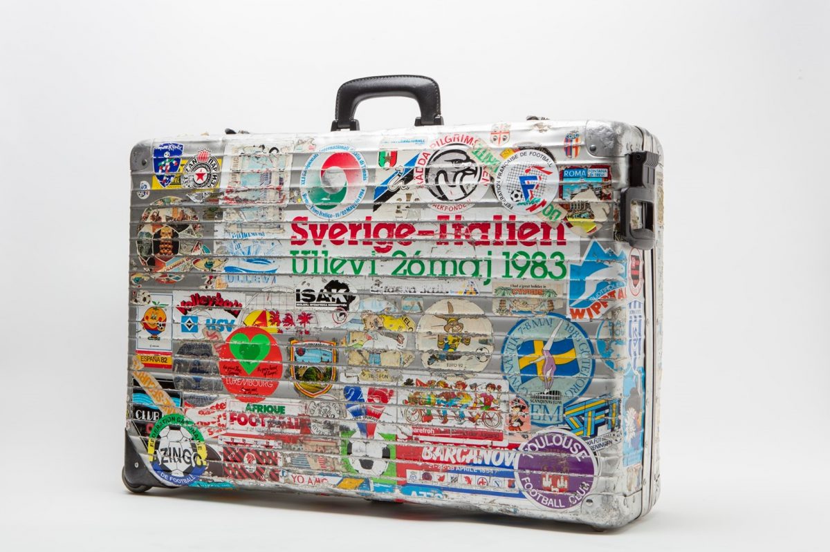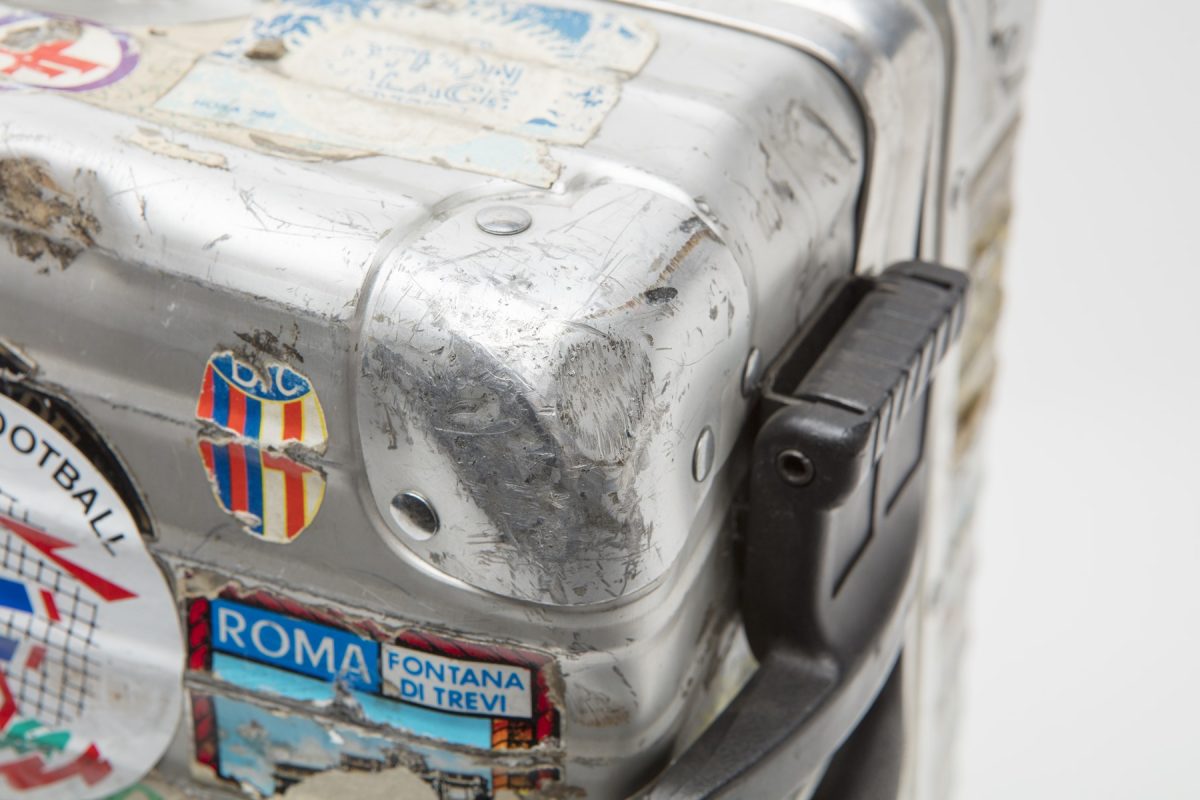リモワが所有するヴィンテージのアルミニウム製スーツケース。年式は不明。トランクの全体に散りばめられた圧倒的なまでのステッカーのカスタマイズは、以前のオーナーによるもの。無数のキズとともにケースと一体化するほど馴染んでいるのが興味深い。このように、個体の数だけストーリーが存在することも、リモワの大きな魅力である。