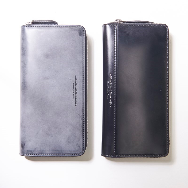 新喜皮革でなめした馬革だけを使ったクラフトレザーブランドTHE WARMTHCRAFTS-MANUFACTURE。カバン、革小物、アクセサリーなどの革製品を展開し、大阪には旗艦店も構えている。ラウンド長財布/ロウ引きのコードバンは、使い馴染んでいくと徐々に艶々になっていくのがお楽しみ。左はロウ引きモデル6万4800円、右は鏡面仕上げにしたモデル6万4800円