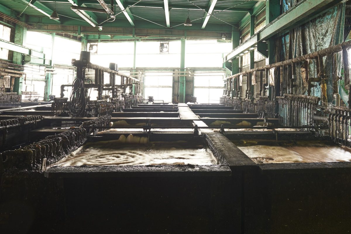 「狭い場所に3つのタンニン層を置いて、なめしのテストを繰り返しました。思えば、よくあんな小さな場所でやっていたなと」と常喜氏。石油ショックの際はブーツの需要が増え、稼ぎがよかった牛革なめし業者を尻目に、それでも頑なに馬革なめしに邁進する。