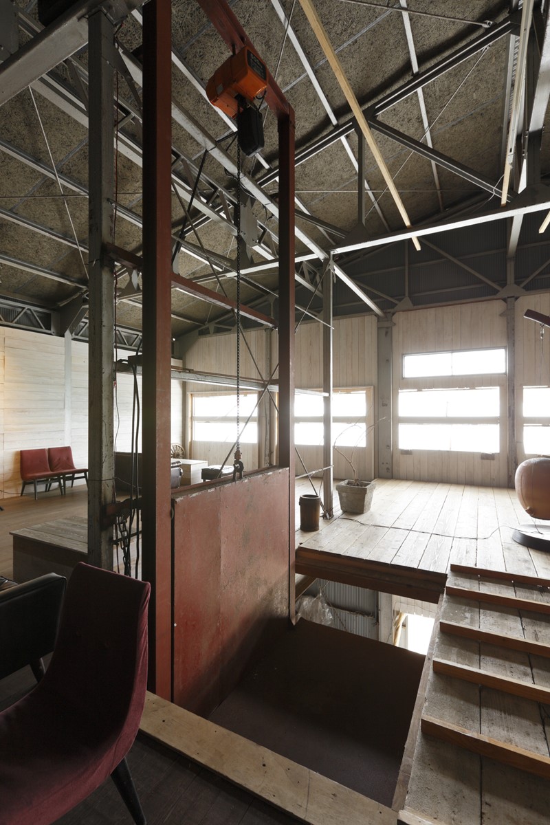 土日祝日しか営業していない同店。クリーム色のトタンで覆われた外観には、店の看板らしきものもなく、一見すると本当に倉庫だ。厨房が作られた一階には、当時のままの床と、荷下ろし用のリフトが今も残っている。木製の階段などは新たに作ったもので、どれも無骨な雰囲気を醸している。
