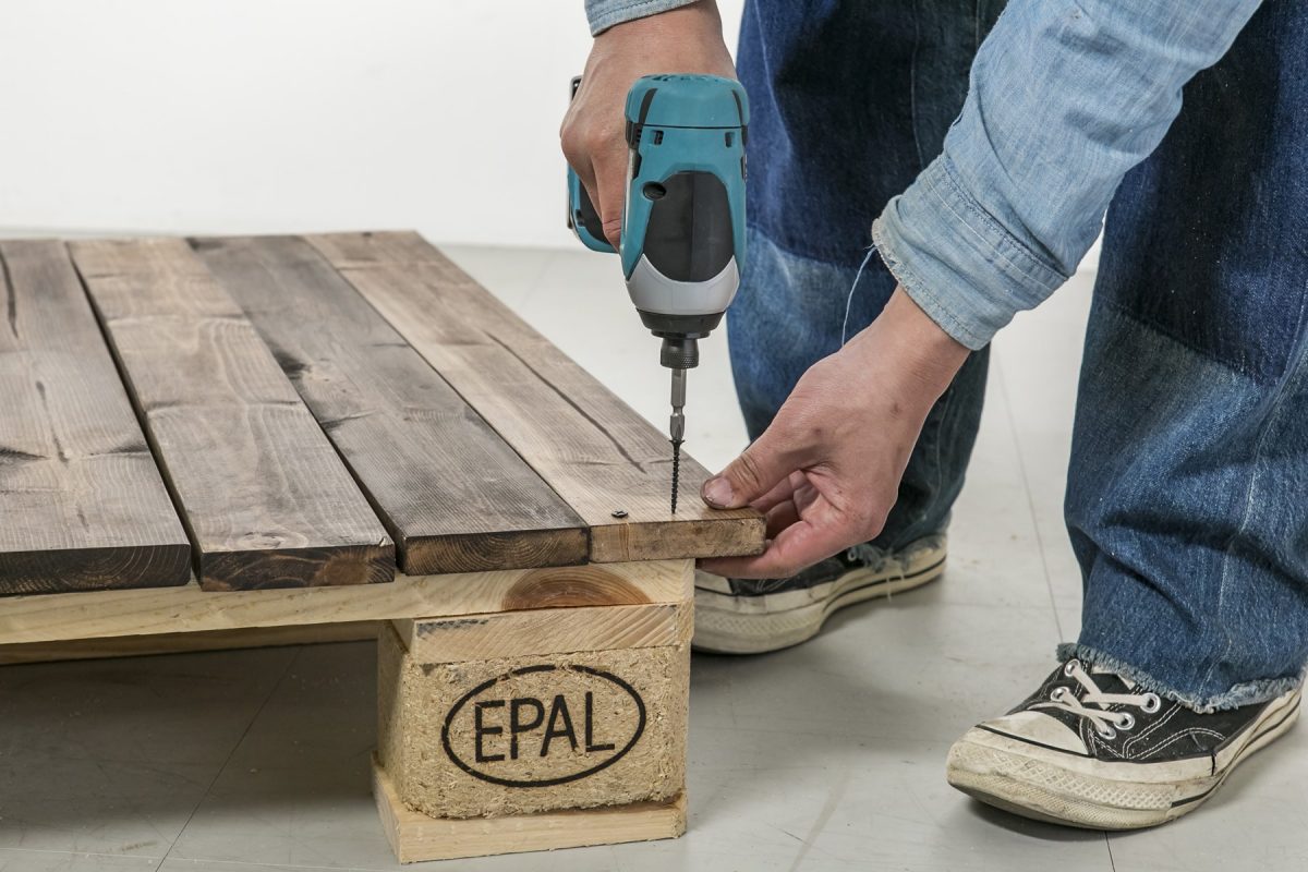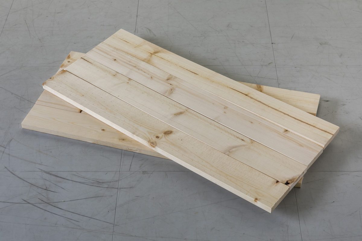1×4材が乾いたら、天板を作る。天面になるパレットに1×4材を一枚ずつ並べてしっかり固定する。
