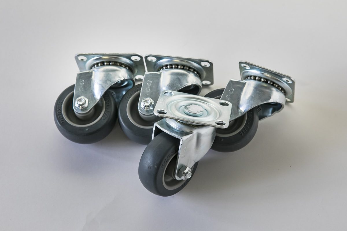 ユーロパレットは重量があるため移動が重労働。キャスターを付けることで移動しやすくなること請け合い。4個用意。各約300円