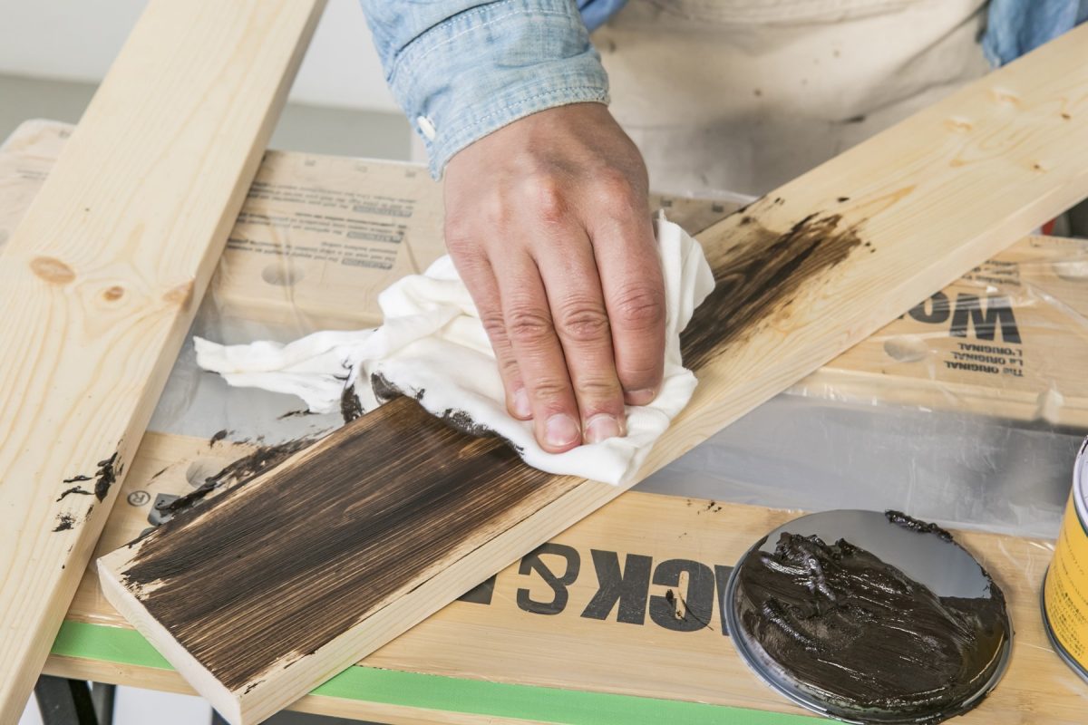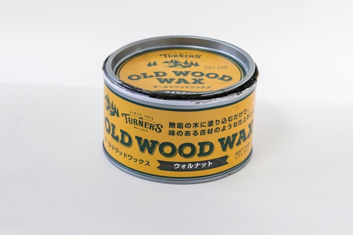 無垢の木に塗り込むだけで古材のような仕上がりになるソフトタイプのワックス。今回はウォルナットを使用。3240円