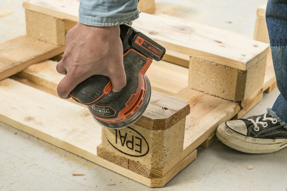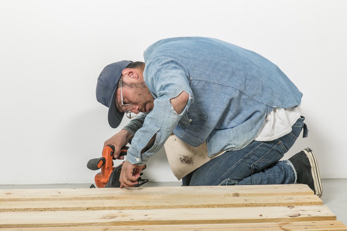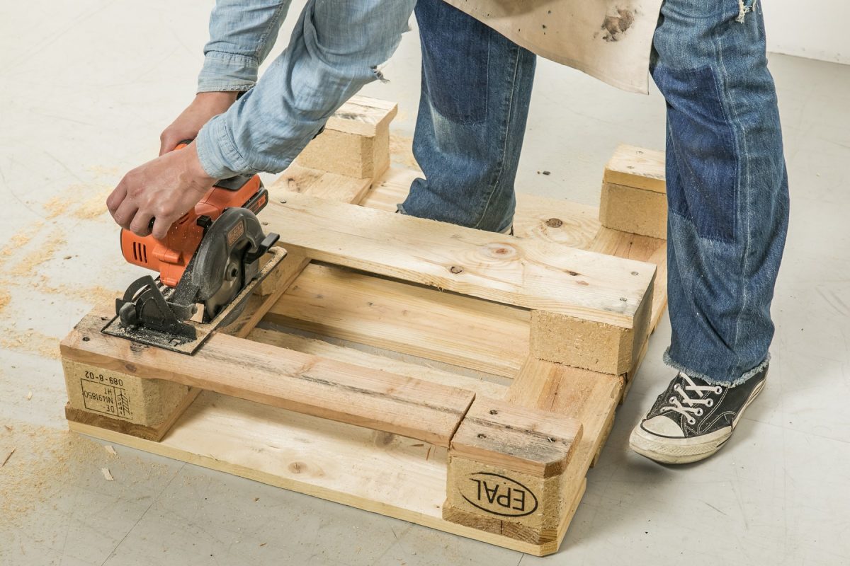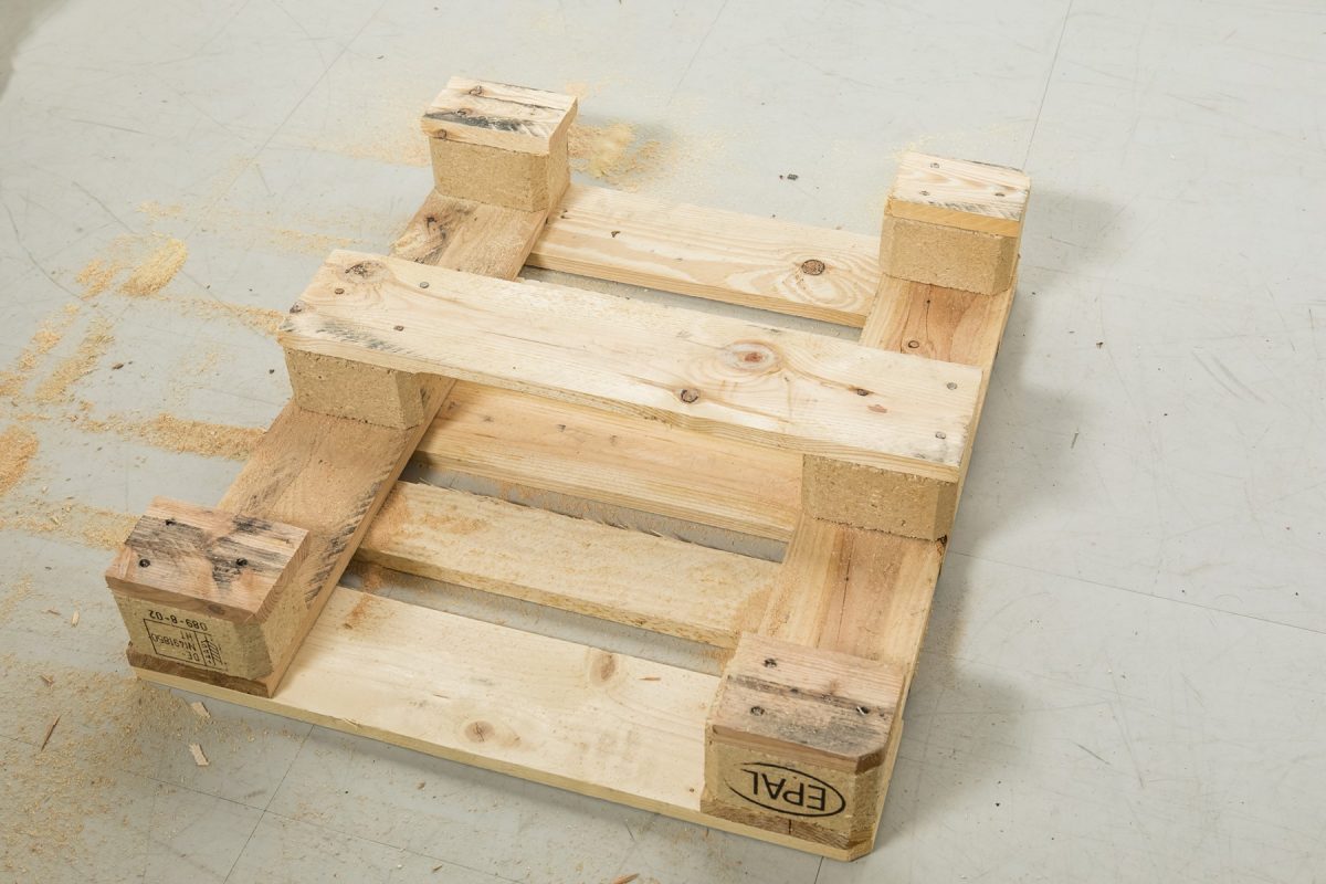 もう1つのユーロパレットも同じようにカットしたら、パレット全体をサンディングする。角も忘れずに研磨しよう。