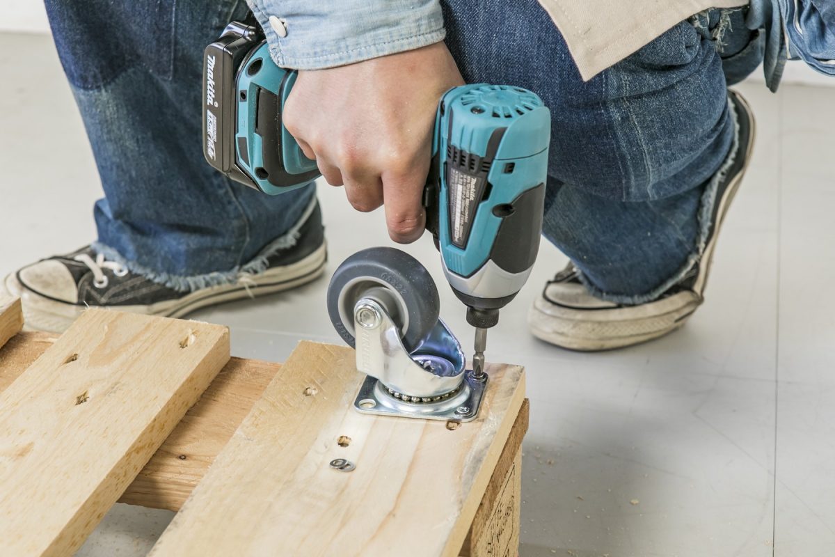 2つのパレットは最終的に重ねて使用する。底面になる方のパレットを決め、四隅にキャスターを装着する。