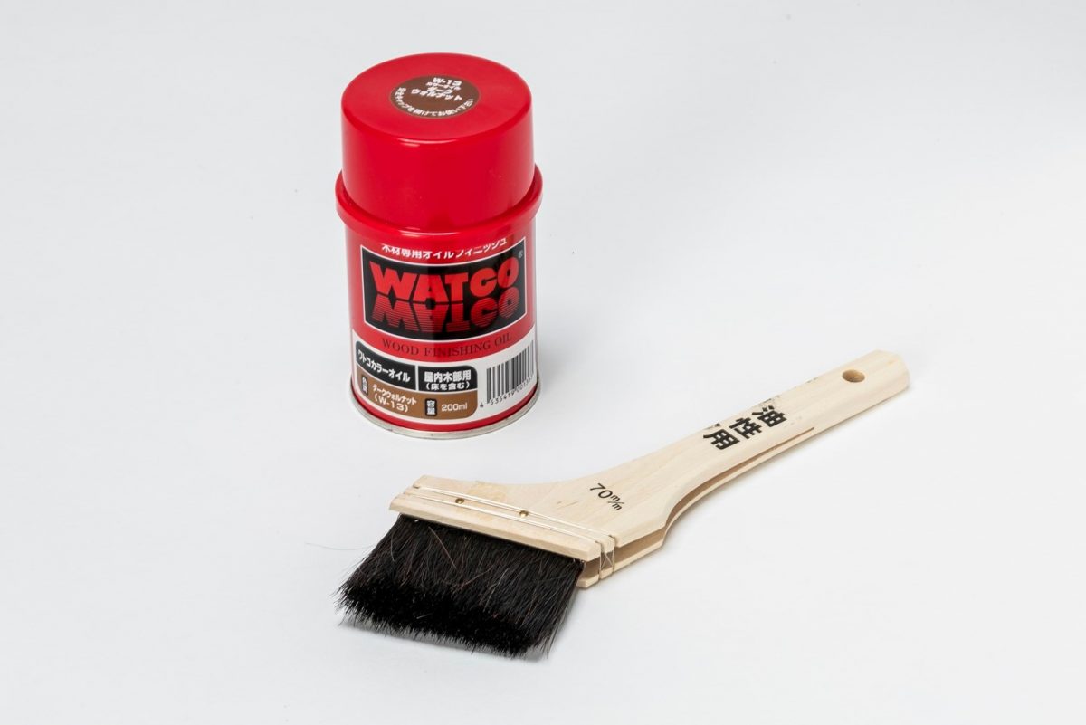ワトコオイルは木材専用のオイルフィニッシュ。今回はダークウォルナットで、何年も使い込んだかのような仕上がりにしてみる。200ml、950円