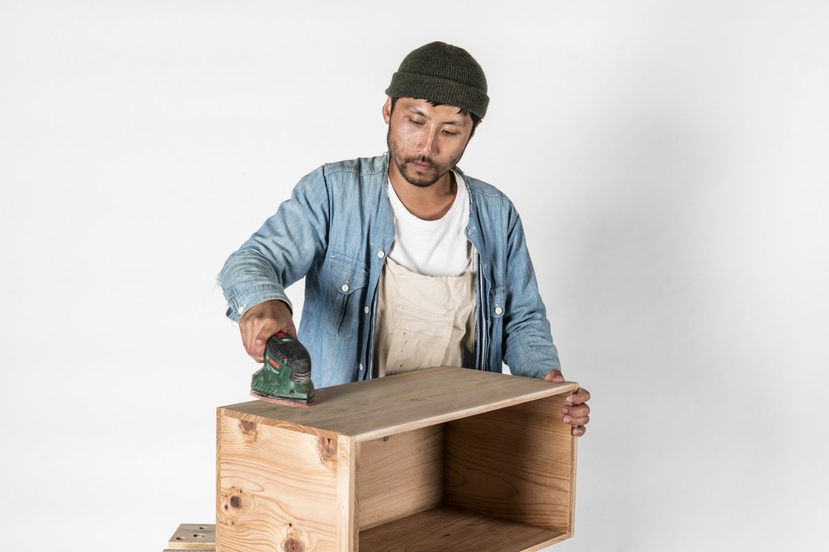 まず、りんご箱の表面と内側をサンディングして滑らかにする。サンディングすることでワトコオイルが染み込みやすくなるのだ。