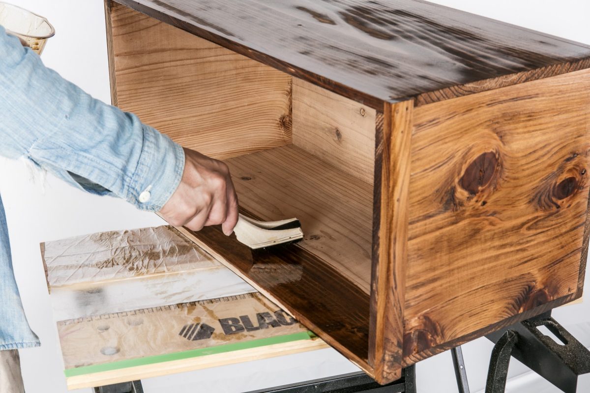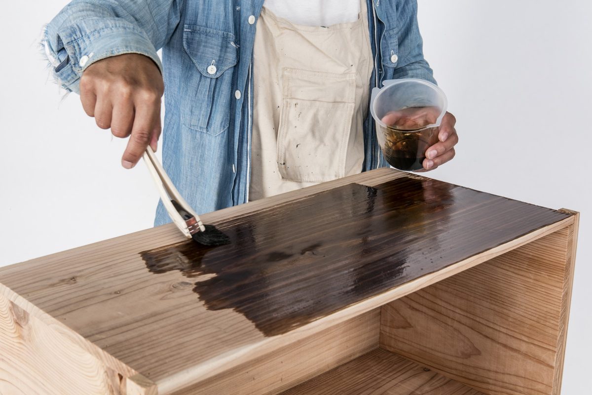 ワトコオイルをりんご箱全体に塗る。木目に沿って同じ方向に塗っていくとキレイに仕上がる。またワトコオイルを塗る前に釘や金槌などで表面を軽く叩くと濃淡ができ雰囲気が出るぞ。